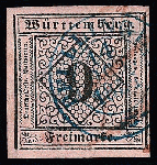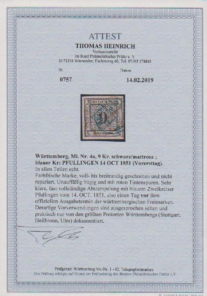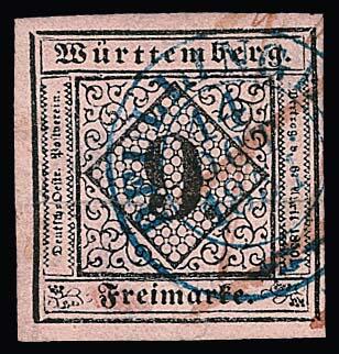| Zusatzinformationen und Suchstichworte: | Rauhut & Kruschel - 213. Auktion 16. - 17. September 2022 Los 259 Altdeutschland Württemberg 9 Kr. schw./rosa, breitrandig (unauffällig bügig), mit blauem Vor-Ersttags-K2 "Pfullingen 14. Oct. 1851", die roten Tintenstriche deuten darauf hin, dass die Marke noch nicht anerkannt wurde. Auf einer 9-Kr.-Marke, zudem mit einem Stempel eines kleinen Postortes, eine Rarität Ausruf 1.300,00 EUR |