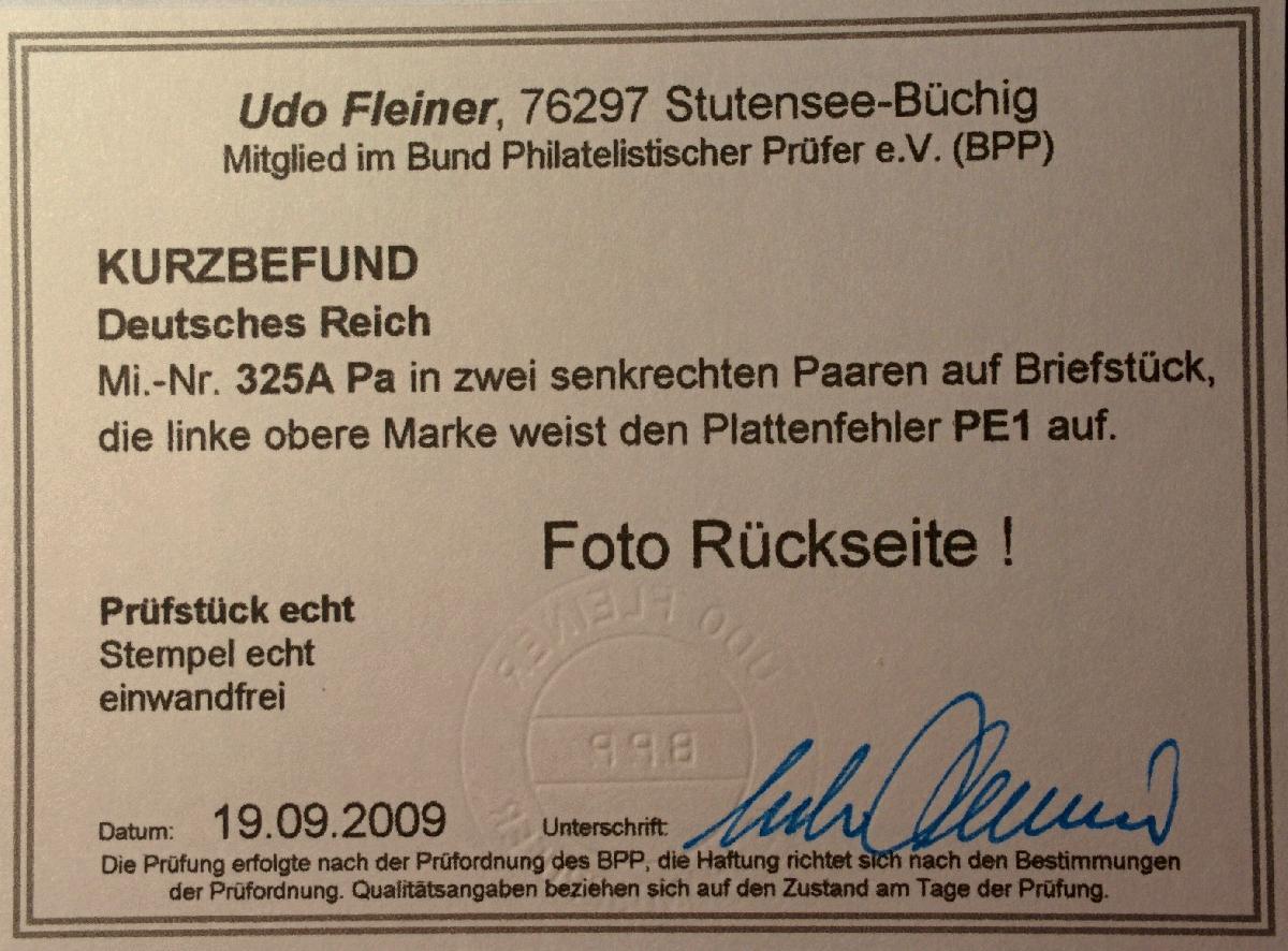 | Prüfer: | Fleiner, Udo (BPP (Bund Philatelistischer Prüfer)) |