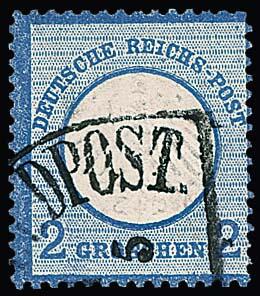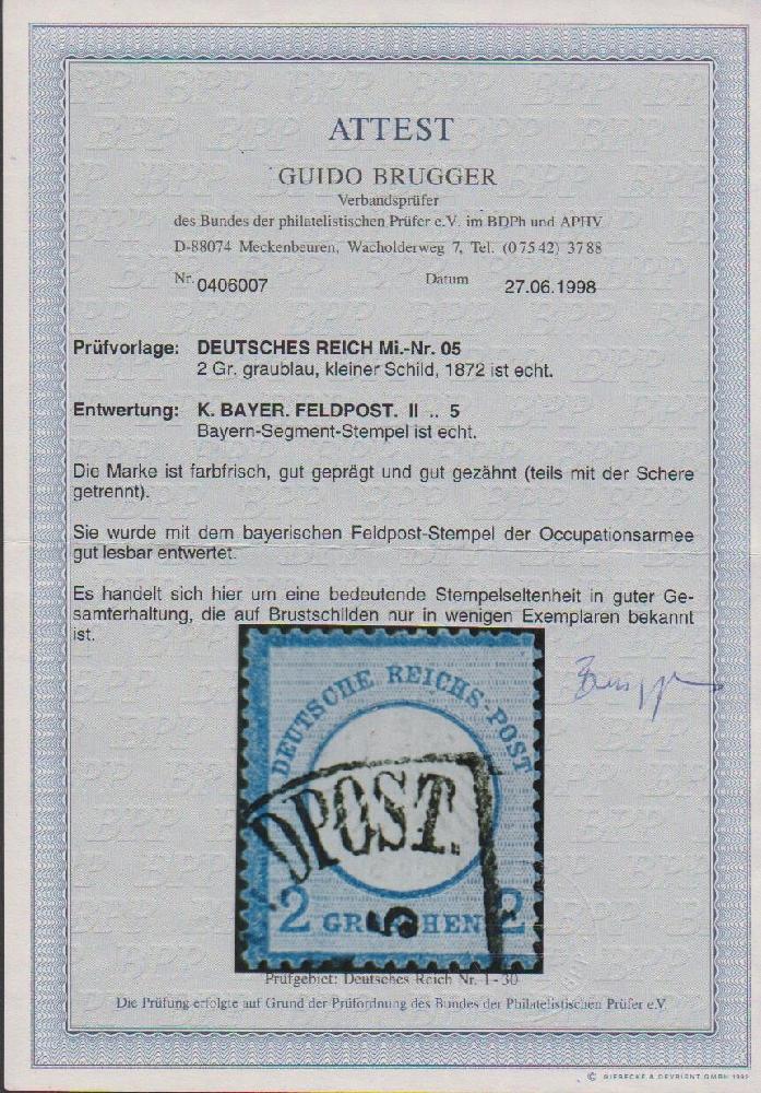 | Zusatzinformationen und Suchstichworte: | Rauhut & Kruschel - 213. Auktion 16. - 17. September 2022 Los 281 Deutsches Reich, 1872 Kleiner Brustschild 2 Gr. blau, Kabinettstück mit bayerischem (!) Feldpost-HK "K. BAYER. FELDPOST. II". Sign. Hennies und Attest Brugger "bedeutende Stempelseltenheit ... nur in wenigen Exemplaren bekannt" Ausruf 250,00 EUR |