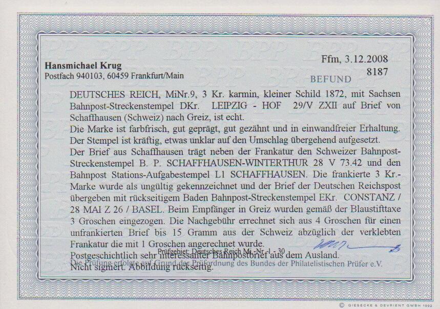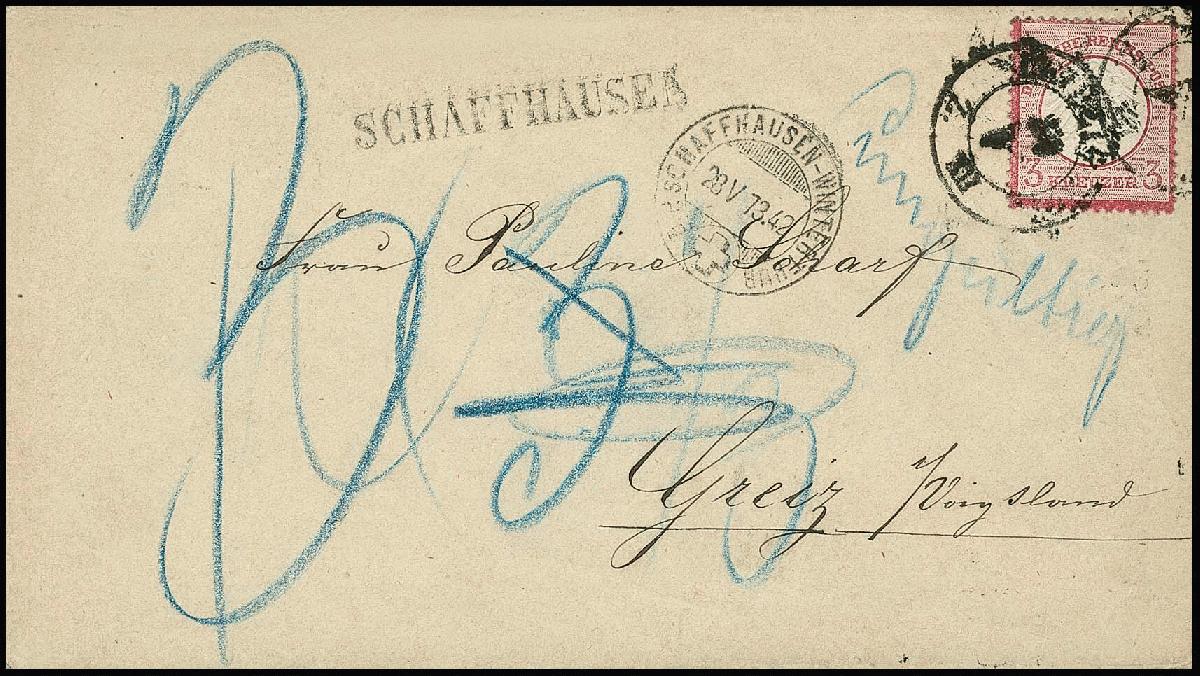 | Zusatzinformationen und Suchstichworte: | Rauhut & Kruschel - 213. Auktion 16. - 17. September 2022 Los 285 Deutsches Reich, 1872 Kleiner Brustschild 3 Kr. karmin, perfektes Exemplar auf Couvert nach Greiz, in der Schweiz bei der Bahnpost aufgeliefert, mit L1 "Schaffhausen" und Zug-DB "Schaffhausen-Winterthur", hs. "ungültig" und mit "3" Gr. in Deutschland nachtaxiert, wobei die 3 Kr. als 1 Gr. angerechnet wurden, also statt 4 Gr. für einen unfrankierten Brief. Die Marke dann auf dem Bahnpost-Weg mit Zug-K2 "Leipzig-Hof" nachentwertet. Postgeschichtlich interessanter Brief! Ausruf 500,00 EUR |