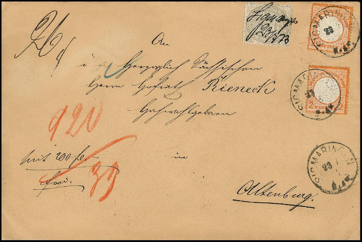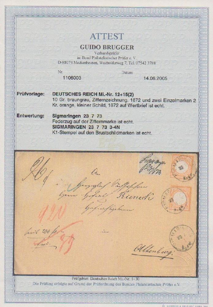| Zusatzinformationen und Suchstichworte: | Rauhut & Kruschel - 213. Auktion 16. - 17. September 2022 Los 286 Deutsches Reich, 1872 Kleiner Brustschild 10 Gr. graubraun in Mischfrankatur mit zwei Exemplaren 2 Kr. orange, kl. Schild, auf aktenfrischem Wertbrief über 200 Gulden nach Altenburg, K1 "Sigmaringen 23/7 73", die 10 Gr. mit Federzug entwertet (re. oben kl. Randspalt und einige stumpfe Zähnchen). Eine ausserordentlich seltene Frankatur-Kombination in guter Qualität Zuschlag 1.800,00 EUR |