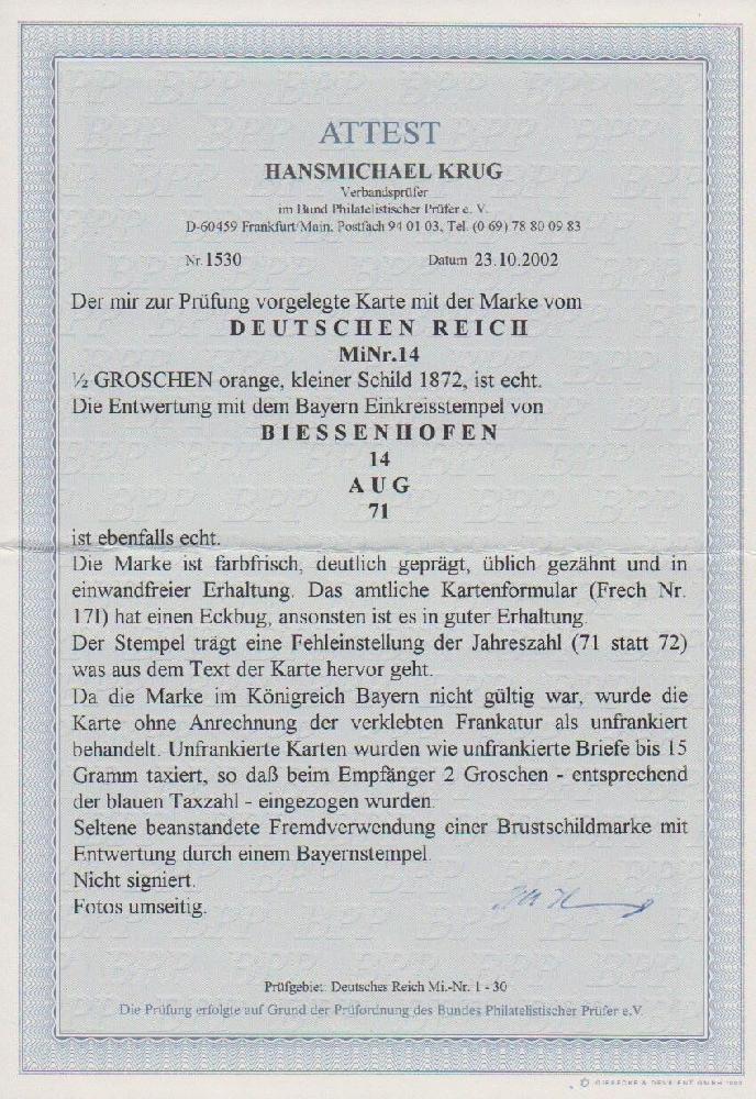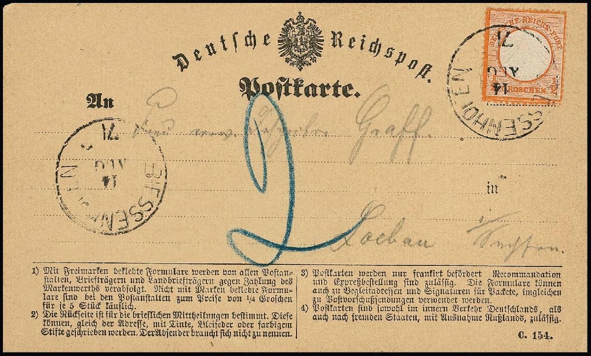 | Zusatzinformationen und Suchstichworte: | Rauhut & Kruschel - 213. Auktion 16. - 17. September 2022 Los 287 Deutsches Reich, 1872 Kleiner Brustschild 1/2 Gr. orange, Kabinettstück in seltener Fremdverwendung mit bayerischem K1 "Biessenhofen 14. Aug. 71" (Fehleinstellung, Text rs. 1872) auf Postkarte (Formular kl. Eckbug) nach Loebau in Sachsen, nicht anerkannt und mit "2" Groschen Nachporto belegt Ausruf 400,00 EUR |