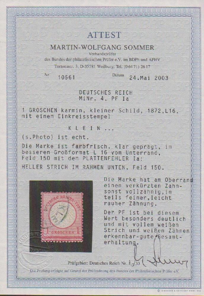 | Zusatzinformationen und Suchstichworte: | Rauhut & Kruschel - 213. Auktion 16. - 17. September 2022 Los 5038 Deutsches Reich, 1872 Kleiner Brustschild 1 Gr. rosa (oben ein Zahn), gestempelt, mit aussergewöhnlich gut sichtbarem Plattenfehler von Feld 10 (dadurch L16), "heller Strich im Rahmen unten", Attest Sommer. Mi. 550,- Ausruf 80,00 EUR |
