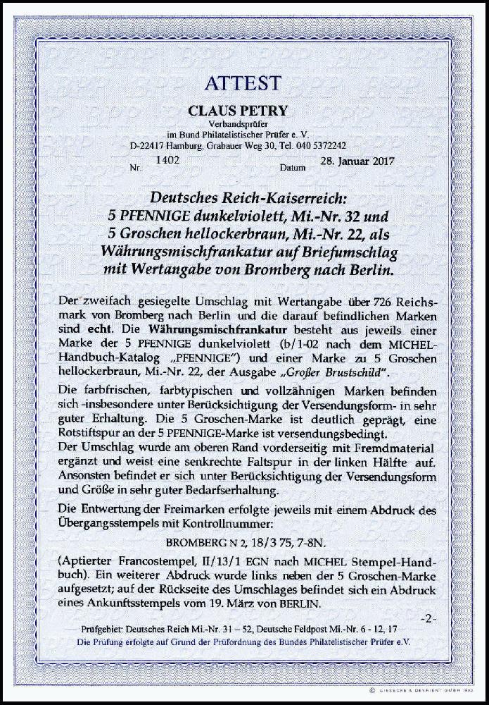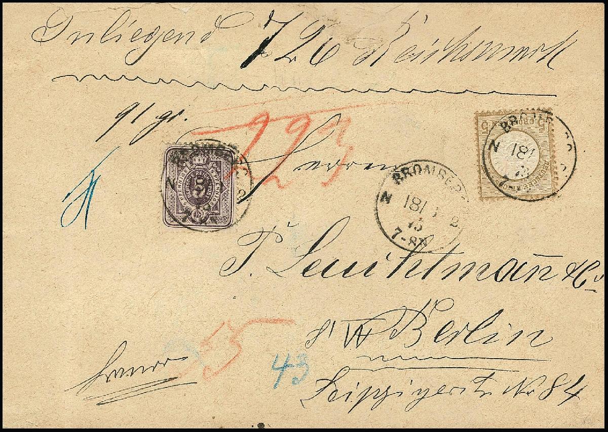 | Zusatzinformationen und Suchstichworte: | Rauhut & Kruschel - 213. Auktion 16. - 17. September 2022 Los 5230 Deutsches Reich, 1875 Pfennige 5 Gr. ockerbraun in Währungs-Mischfrankatur mit 5 Pfge. dunkelviolett, Kabinettstücke mit K1 "Bromberg N2. 18/3 75" (aptierter Frankostempel) auf Wertbrief über 726 Reichsmark (91gr.) nach Berlin (Umschlag oben etwas fehlerhaft). Eine aussergewöhnliche Frankatur-Kombination, wobei der vorliegende Brief im Handbuch und Katalog der Währungs-Mischfrankaturen nicht erfasst ist Ausruf 500,00 EUR |