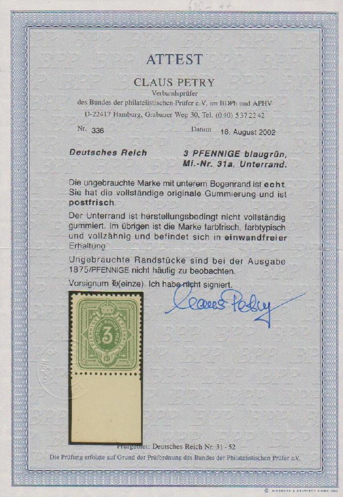 | Zusatzinformationen und Suchstichworte: | Rauhut & Kruschel - 213. Auktion 16. - 17. September 2022 Los 5279 Deutsches Reich, 1875 Pfennige 3 Pfge. grün, tadellos postfrisches Unterrandstück, Attest Petry. Mi. 600,- Zuschlag 335,00 EUR |