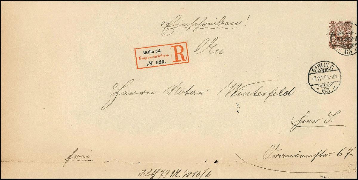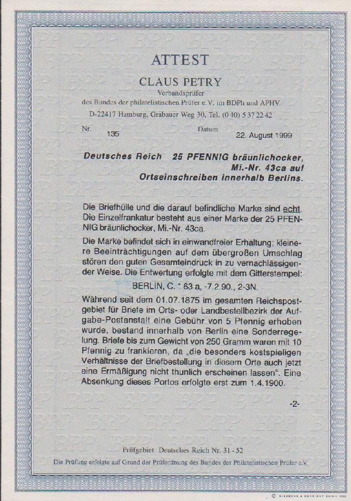 | Zusatzinformationen und Suchstichworte: | Rauhut & Kruschel - 213. Auktion 16. - 17. September 2022 Los 5490 Deutsches Reich, 1880/89 Pfennig 25 Pfg. bräunlichocker, tadellos, als Einzelfrankatur auf großformatigem und übergewichtigem Orts-Einschreibebrief (kl. Randfehler) aus Berlin 1890. Während für das gesamte andere Reichsgebiet ein Porto von 5 Pfg. für Ortsbriefe bis 250gr. erhoben wurde, bestand lediglich in Berlin die Sonderregelung, dass Ortsbriefe 10 Pfg. kosteten. Selbst bei einer Mengenauflieferung waren für die ersten 15 Briefe 10 Pfg. zu bezahlen und erst ab dem 16. Brief wurden nur 5 Pfg. erhoben. Insofern sind eingeschriebene Ortsbriefe aus Berlin mit der Portorate von 25 Pfg. Raritäten, die nur bei Mengenaufgabe möglich war, lt. Attest Petry "gehören sie zu den seltensten und ausgefallensten Erscheinungsformen im Bereich der bis zum 1.4.1900 möglichen Portostufen." Ausruf 250,00 EUR |