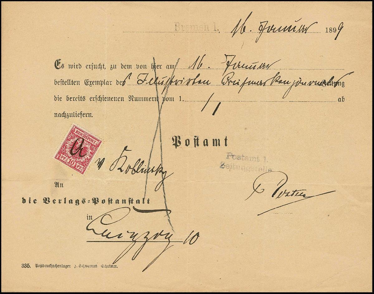 | Zusatzinformationen und Suchstichworte: | Rauhut & Kruschel - 213. Auktion 16. - 17. September 2022 Los 5550 Deutsches Reich, 1889 Krone/Adler 10 Pfg. hs. entwertet auf seltenem Formular für eine Zeitungssache 1899 vom Postamt Bremen nach Leipzig (für ein Briefmarkenjournal), ausführliches Attest Petry mit Verweis auf die Seltenheit Zuschlag 100,00 EUR |