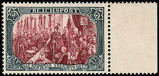 | Zusatzinformationen und Suchstichworte: | Rauhut & Kruschel - 213. Auktion 16. - 17. September 2022 Los 328 Deutsches Reich, Germania Reichspost 5 Mk. Reichspost, Type II, tadellos postfrisch vom rechten Bogenrand, Mi. 1800,- Ausruf 450,00 EUR |