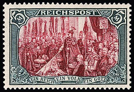 | Zusatzinformationen und Suchstichworte: | Rauhut & Kruschel - 213. Auktion 16. - 17. September 2022 Los 329 Deutsches Reich, Germania Reichspost 5 Mk. Reichspost, Type III, tadellos postfrisch, Mi. 1800,- Ausruf 450,00 EUR |
