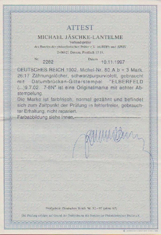 | Prüfgebiet: | Deutsches Reich 1871 - 1918 (Mi-Nr. 1 - 106) |
