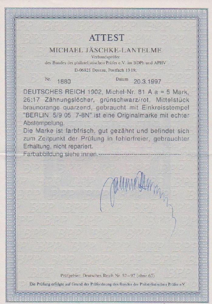 | Prüfer: | Jäschke-Lantelme, Michael (BPP (Bund Philatelistischer Prüfer)) |