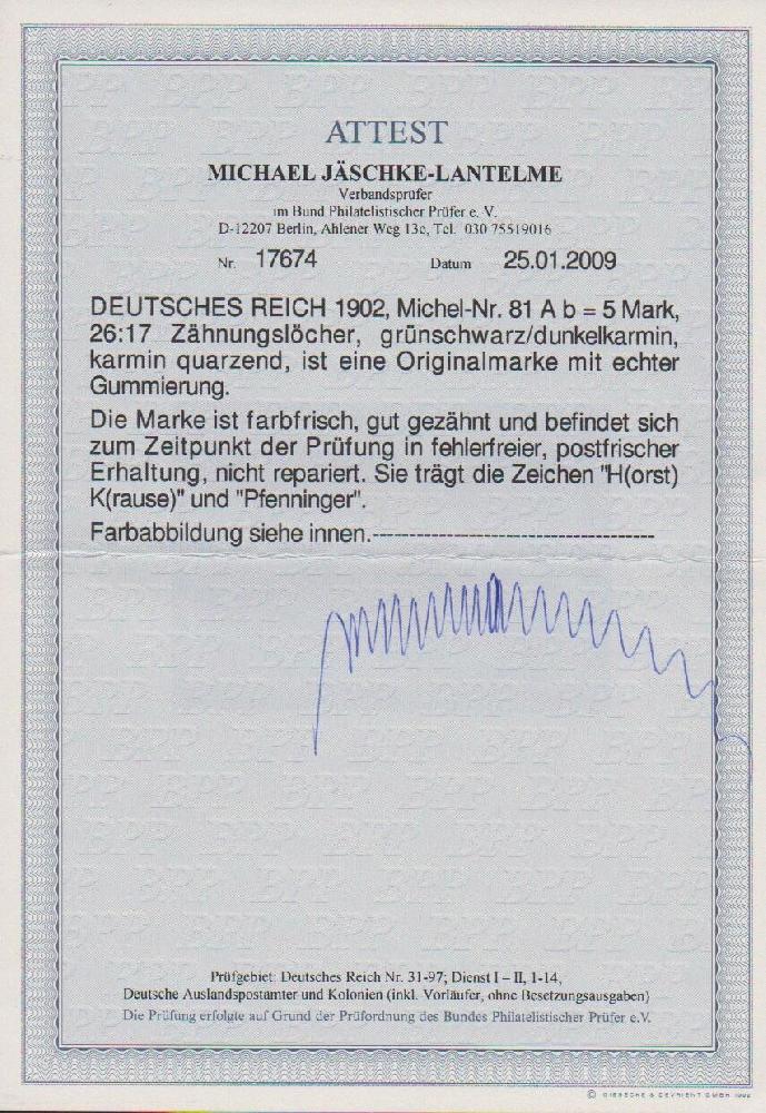 | Prüfgebiet: | Deutsches Reich 1871 - 1918 (Mi-Nr. 1 - 106) |