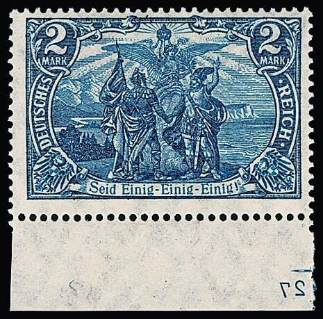 | Zusatzinformationen und Suchstichworte: | Rauhut & Kruschel - 213. Auktion 16. - 17. September 2022 Los 348 Deutsches Reich, Germania mit WZ 2 Mk. Kriegsdruck, gute Zähnung, tadellos postfrisch vom Unterrand mit dort spiegelverkehrter Plattennummer "27" (selten), Mi. ca. 800,- Ausruf 200,00 EUR |
