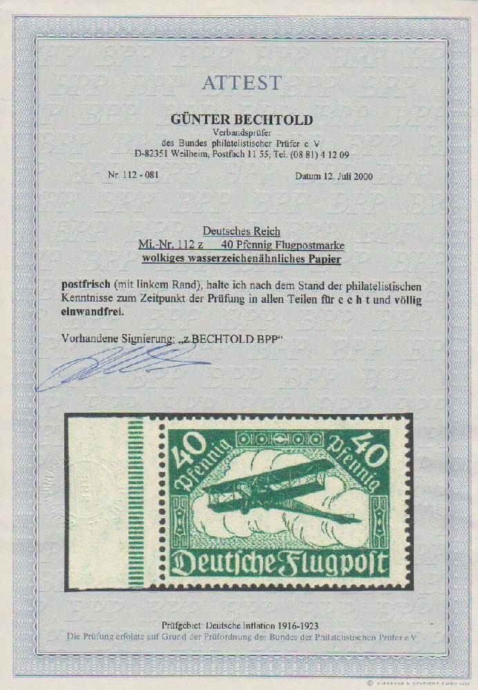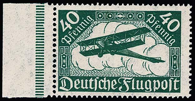 | Zusatzinformationen und Suchstichworte: | Rauhut & Kruschel - 213. Auktion 16. - 17. September 2022 Los 5723 Deutsches Reich, 1919-1920 40 Pfg. Flugpost auf wolkigem wasserzeichenähnlichem Papier postfrisch vom Rand, Mi. 1100,- Ausruf 280,00 EUR |