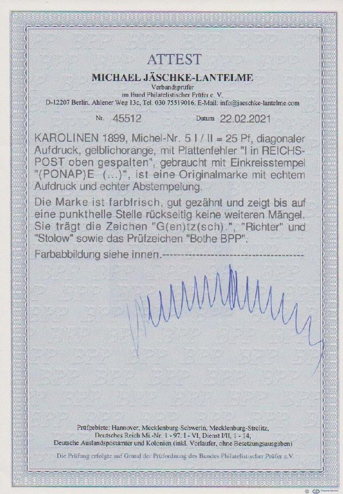 | Zusatzinformationen und Suchstichworte: | Rauhut & Kruschel - 213. Auktion 16. - 17. September 2022 Los 374 Deutsche Kolonien Karolinen 25 Pfg. diagonaler Aufdruck mit Plattenfehler "I in REICHSPOST oben gespalten", gestempelt "Ponape", punkthelle Stelle (gut sign. Bothe u.a.), sehr seltener Plattenfehler, schon die normale Marke wertet 3400,- Mi., der Plattenfehler "-.-" Ausruf 750,00 EUR |