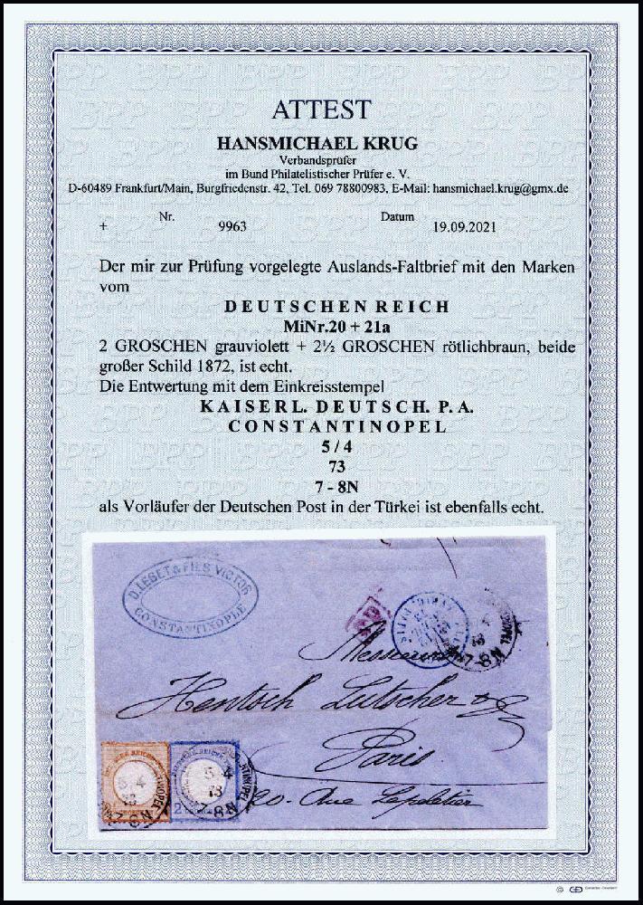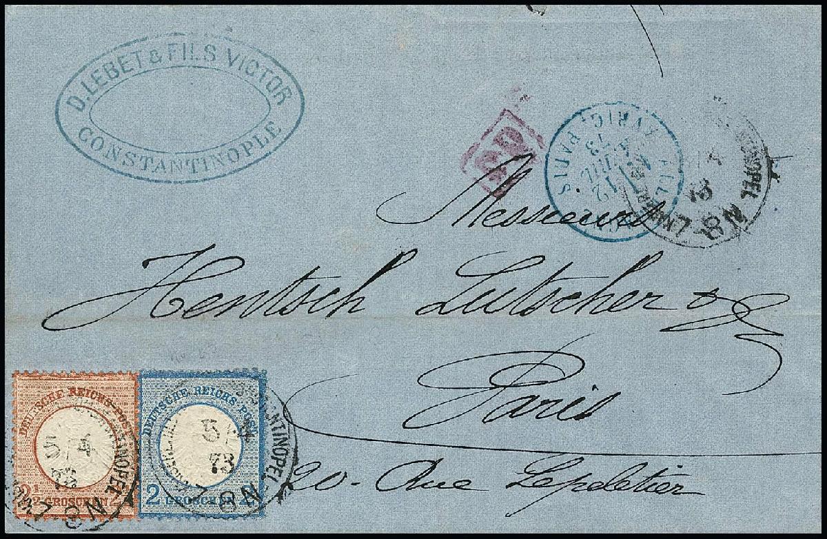 | Zusatzinformationen und Suchstichworte: | Rauhut & Kruschel - 213. Auktion 16. - 17. September 2022 Los 6479 Deutsche Auslandspost Türkei Vorläufer Brustschilde 2 Gr. blau und 2 1/2 Gr. rötlichbraun, Kabinettstücke auf Faltbrief nach Paris, zentr. Stempel "KDPA CONSTANTINOPEL 6/5 73" Ausruf 400,00 EUR |