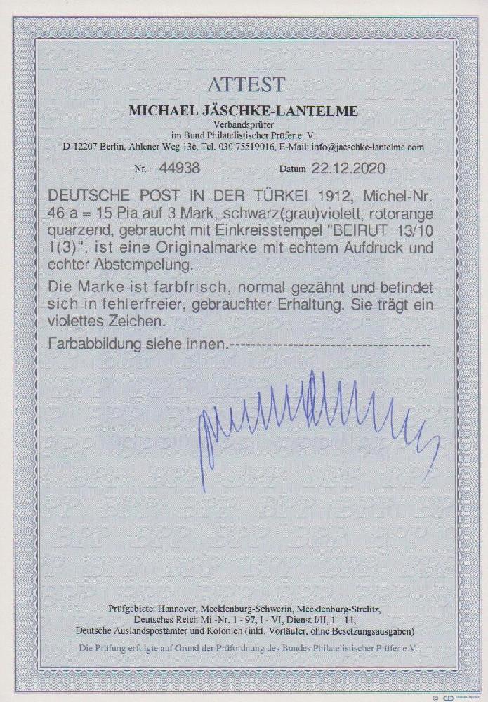 | Zusatzinformationen und Suchstichworte: | Rauhut & Kruschel - 213. Auktion 16. - 17. September 2022 Los 6492 Deutsche Auslandspost Türkei 15 Pia. a. 3 Mk. schwarzgrau/violett tadellos gestempelt "Beirut", Mi. 600,- Zuschlag 175,00 EUR |