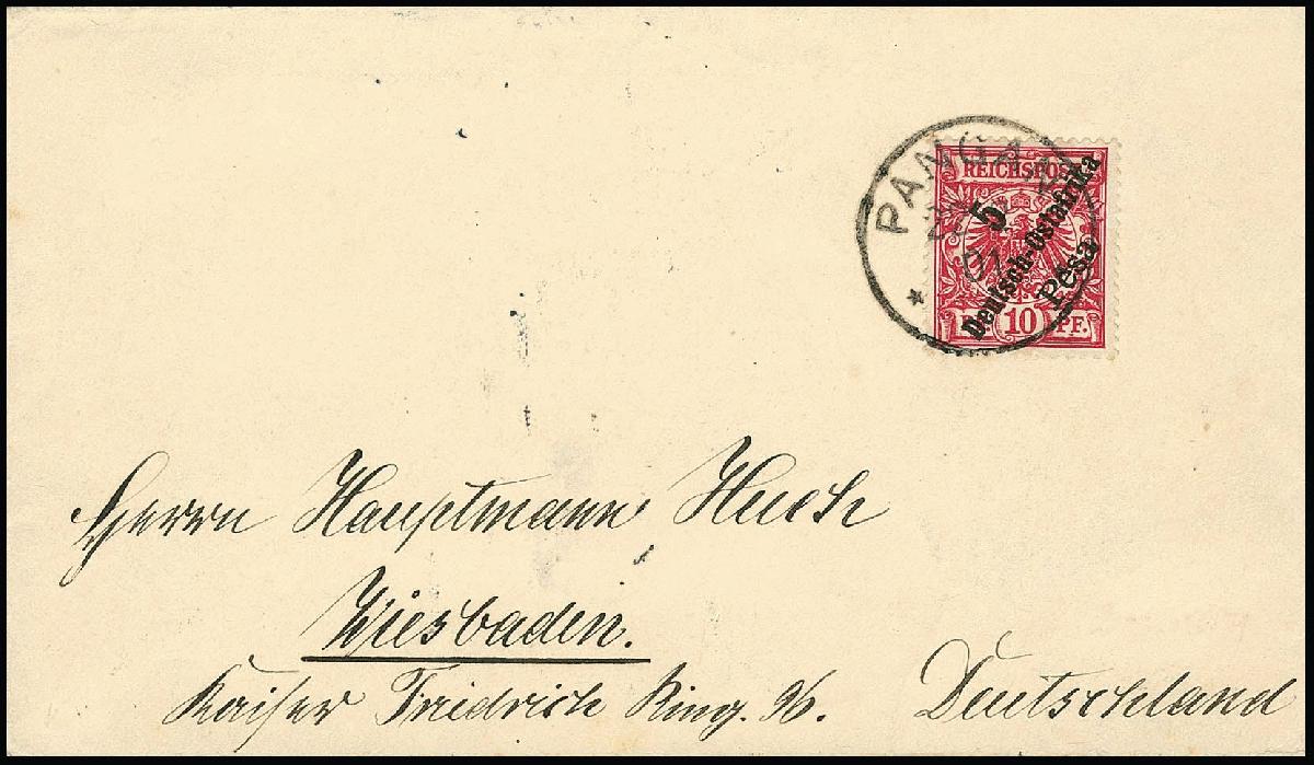 | Zusatzinformationen und Suchstichworte: | Rauhut & Kruschel - 213. Auktion 16. - 17. September 2022 Los 6506 Deutsche Kolonien Ostafrika 5 P. a. 10 Pfg. in guter Farbe rotkarmin, dunkelrot quarzend, auf portoger. Brief aus Tanga 1901, Fotoexp. Jäschke-L. Mi. "-.-" Zuschlag 135,00 EUR |