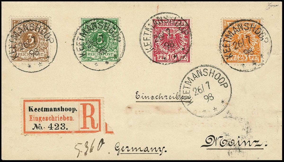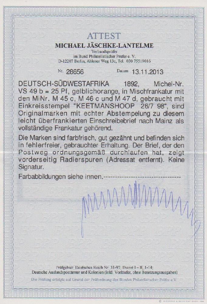 | Zusatzinformationen und Suchstichworte: | Rauhut & Kruschel - 213. Auktion 16. - 17. September 2022 Los 6516 Deutsche Kolonien Südwestafrika Vorläufer 25 Pfg. gelborange, nebst Mitläufern 3, 5 und 10 Pfg., je tadellos, auf R-Brief (Adressname radiert) von Keetmanshoop 1898 nach Mainz, Attest Jäschke-L. Mi. lose gestempelt 480,- Zuschlag 165,00 EUR |
