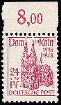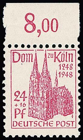 | Zusatzinformationen und Suchstichworte: | Rauhut & Kruschel - 213. Auktion 16. - 17. September 2022 Los 408 Bizone 24 + 16 Pfg. Kölner Dom postfrisch vom Oberrand in seltener Variante, Fotoattest D. Schlegel "einwandfrei", völlig unterbewertete Marke und als Oberrandstück vielleicht Unikat (letzter Zuschlag, Los 7067, 207. Rauhut-Auktion, für ein leicht fehlerhaftes Exemplar, 620,- Euro) Zuschlag 1.120,00 EUR |