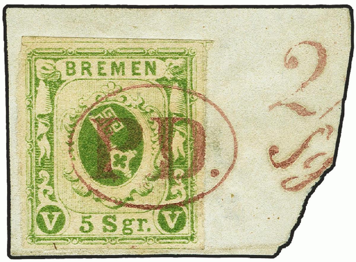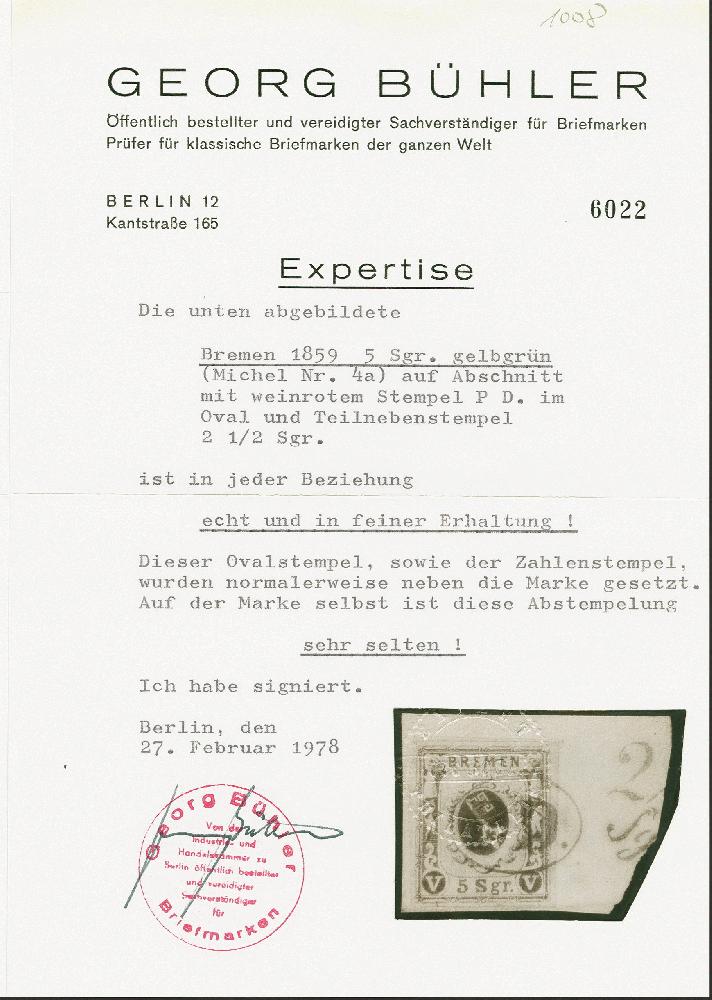 | Zusatzinformationen und Suchstichworte: | 379. Auktion Heinrich Köhler 19. - 24. September 2022 Los 68 5 Silbergroschen schwarzgelbgrün, sehr schön farbfrisch und breit-bis überrandig, sauber entwertet durch roten Ovalstempel "PD." auf Briefstück. Ein sehr schönes und ungewöhnliches Stück in tadelloser Erhaltung. Signiert Hermann und Georg Bühler mit Attest (1978), Fotoattest Neumann BPP (2022) Ausruf 200,00 EUR Zuschlag 1.050,00 EUR (aus der Sammlung Erivan Haub) |
