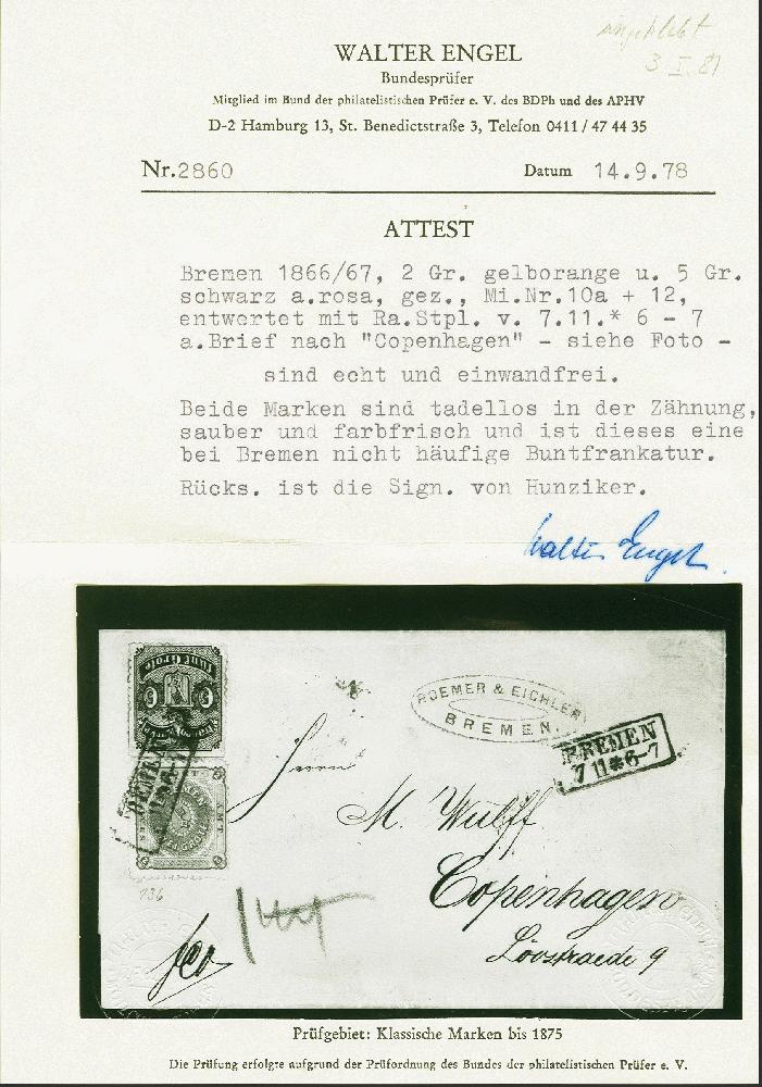 | Zusatzinformationen und Suchstichworte: | 379. Auktion Heinrich Köhler 19. - 24. September 2022 Los 71 1866/67, 2 Grote dunkelorange und 5 Grote auf mattkarmingrau, beide farbfrisch und ausgabetypisch gezähnt, mit sauber auf- und nebengesetztem Rahmenstempel "BREMEN 7 11" (1867) auf Briefhülle der bekannten Wulff-Korrespondenz nach Kopenhagen. Vorderseitig ist das Weiterfranko mit 1¼ Silbergroschen notiert; rückseitig Durchgangsstempel des Stadtpostamtes von Hamburg und Ankunftsstempel. Die 2 Grote-Marke kleiner Eckknitter, sonst tadellose und frische Erhaltung. Ein attraktiver und sehr frischer Auslandsbrief mit seltener Buntfrankatur. Signiert Hunziker und Fotoatteste Engel BPP (1978) und Neumann BPP (2022) Ausruf 5.000,00 EUR Zuschlag 10.000,00 EUR (aus der Sammlung Erivan Haub) |