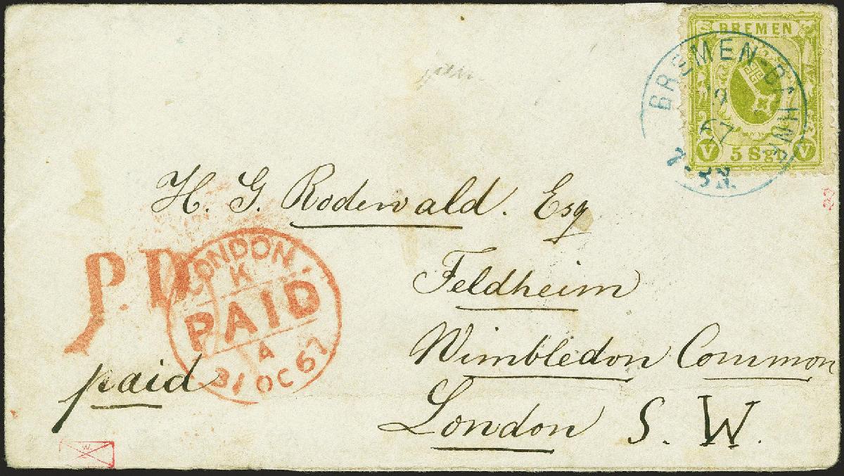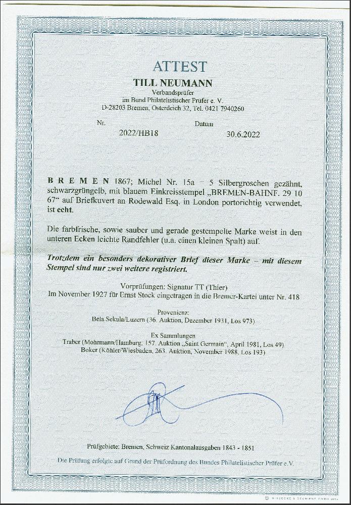 | Zusatzinformationen und Suchstichworte: | 379. Auktion Heinrich Köhler 19. - 24. September 2022 Los 72 1867, 5 Silbergroschen schwarzgrüngelb, farbfrisch und meist gut gezähnt, mit sauber aufgesetztem blauen Einkreisstempel "BREMEN-BAHNHF. 29 10 67" auf kleinem Briefkuvert nach London. Die Marke in den unteren erkennen leichte Randfehler, sonst tadellos. Ein attraktiver Brief mit dem seltenen blauen Stempel. Signiert Thier und Fotoattest Neumann BPP (2022) Ausruf 1.000,00 EUR Zuschlag 2.100,00 EUR (aus der Sammlung Erivan Haub) |