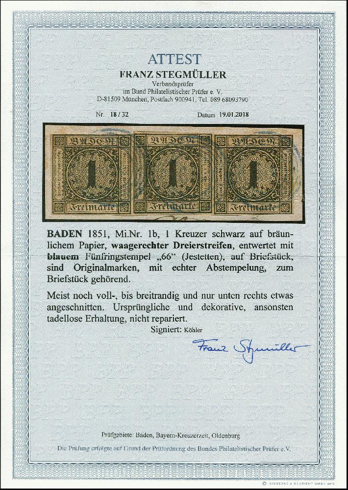 | Zusatzinformationen und Suchstichworte: | 366. Auktion Heinrich Köhler Auktionstermin 19.–24.03.2018 Los 2527 1 Kr. auf bräunlich im waagerechten 3er-Streifen, rechts unten leicht in die Randlinie geschnitten, sonst noch voll- bis breitrandig mit leicht und sauber aufgesetzter blauer Nr. "66" JESTETTEN auf Briefstück; ein dekorativer und in dieser Form recht seltener Streifen, sign. Köhler und Fotoattest Stegmüller BPP (2018) Zuschlag 320,00 EUR |