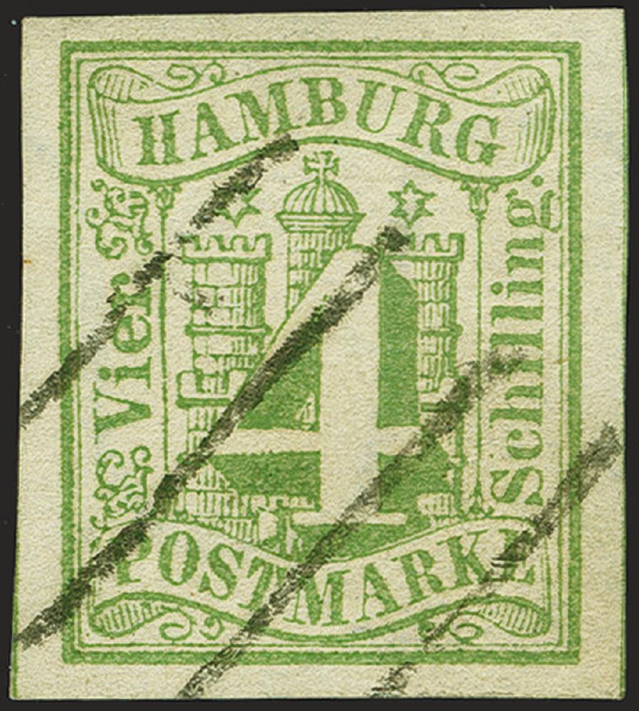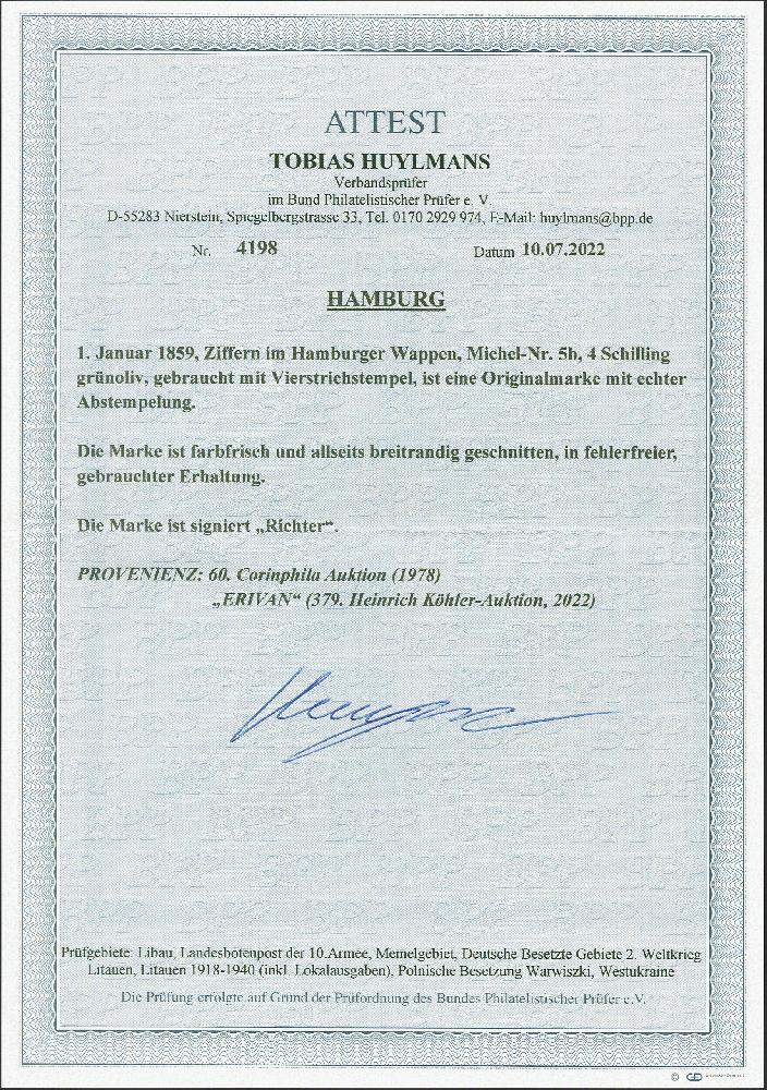 | Zusatzinformationen und Suchstichworte: | 379. Auktion Heinrich Köhler 19. - 24. September 2022 Los 76 4 Schilling bläulichgrün, allseits breitrandig und farbfrisch, sauber entwertet durch Strichstempel, tadellos. Fotoattest Huylmans BPP (2022) Ausruf 400,00 EUR Zuschlag 900,00 EUR (aus der Sammlung Erivan Haub) |