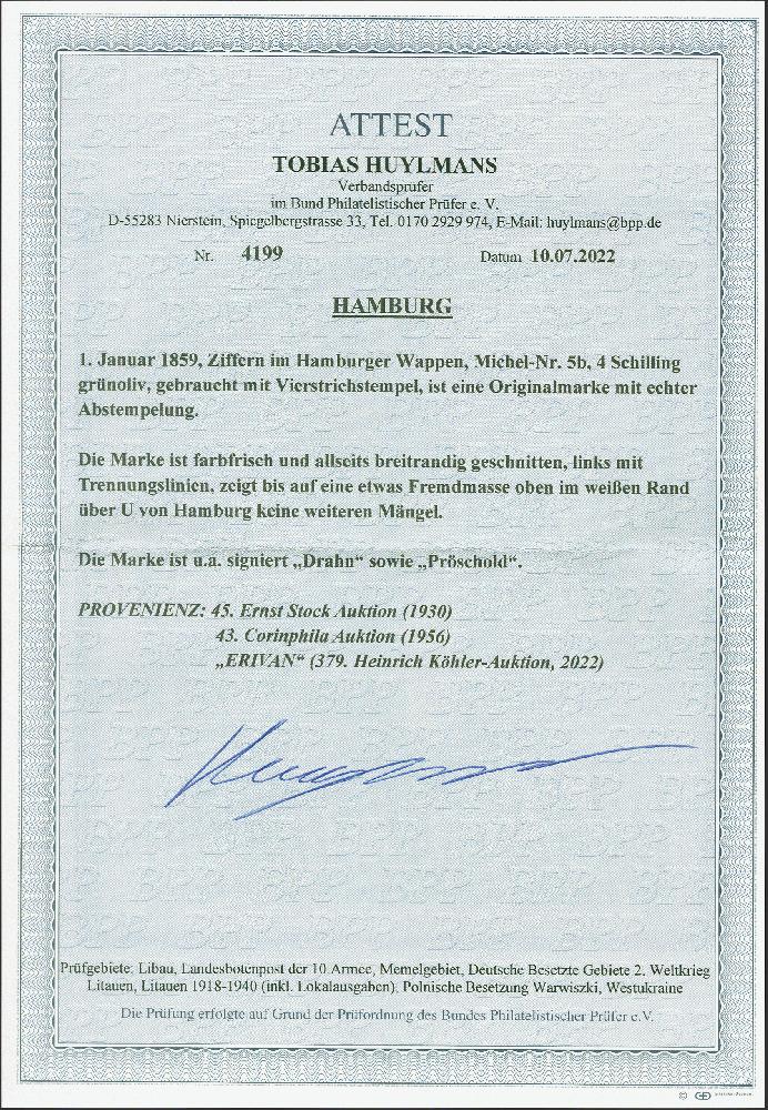 | Zusatzinformationen und Suchstichworte: | 379. Auktion Heinrich Köhler 19. - 24. September 2022 Los 77 4 Schilling bläulichgrün, allseits breitrandig und farbfrisch, sauber entwertet durch Strichstempel, an winziger Stelle etwas Fremdmasse im äußeren Oberrand, sonst tadellos. Fotoattest Huylmans BPP (2022) Ausruf 300,00 EUR Zuschlag 300,00 EUR (aus der Sammlung Erivan Haub) |