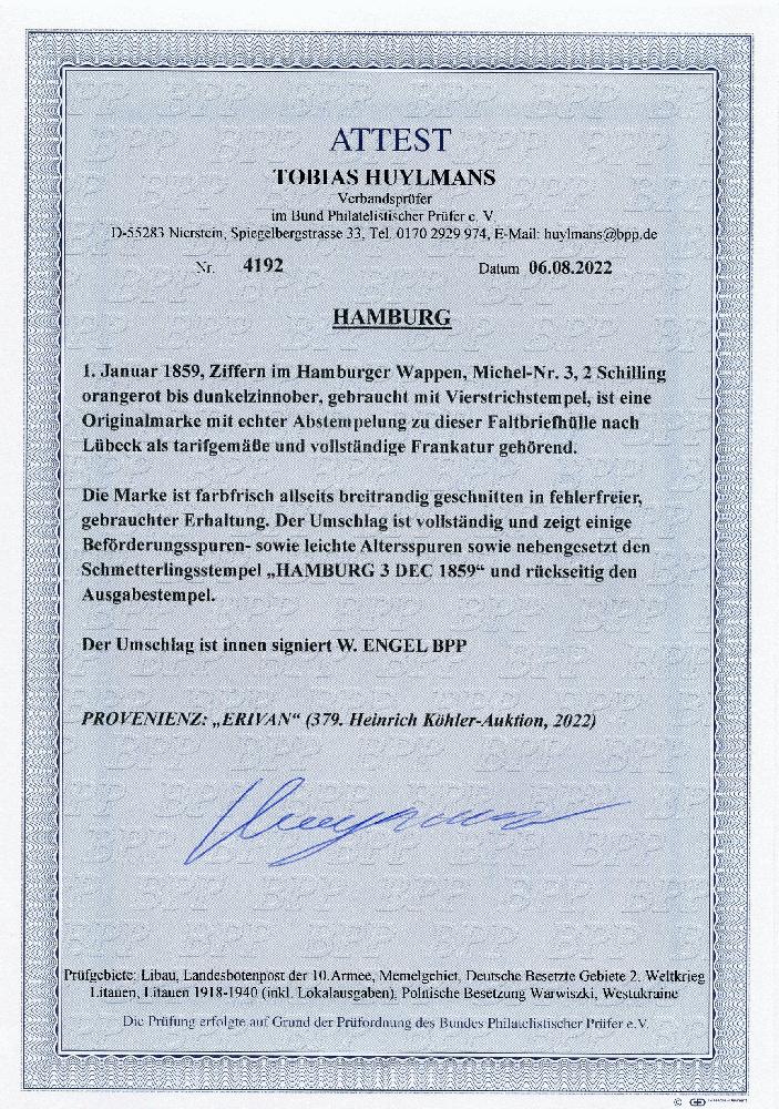 | Zusatzinformationen und Suchstichworte: | 379. Auktion Heinrich Köhler 19. - 24. September 2022 Los 80 2 Schilling rot, voll- bis breitrandig mit sauber aufgesetztem Strichstempel auf kleiner Briefhülle mit sauber nebengesetztem Schmetterlingsstempel "HAMBURG 3 DEC. 1859" nach Lübeck mit Ausgabestempel. Leichte Patina und stärkere Brieffaltung außerhalb der Frankatur, sonst tadellos. Fotoattest Huylmans BPP (2022) Ausruf 300,00 EUR Zuschlag 300,00 EUR (aus der Sammlung Erivan Haub) |
