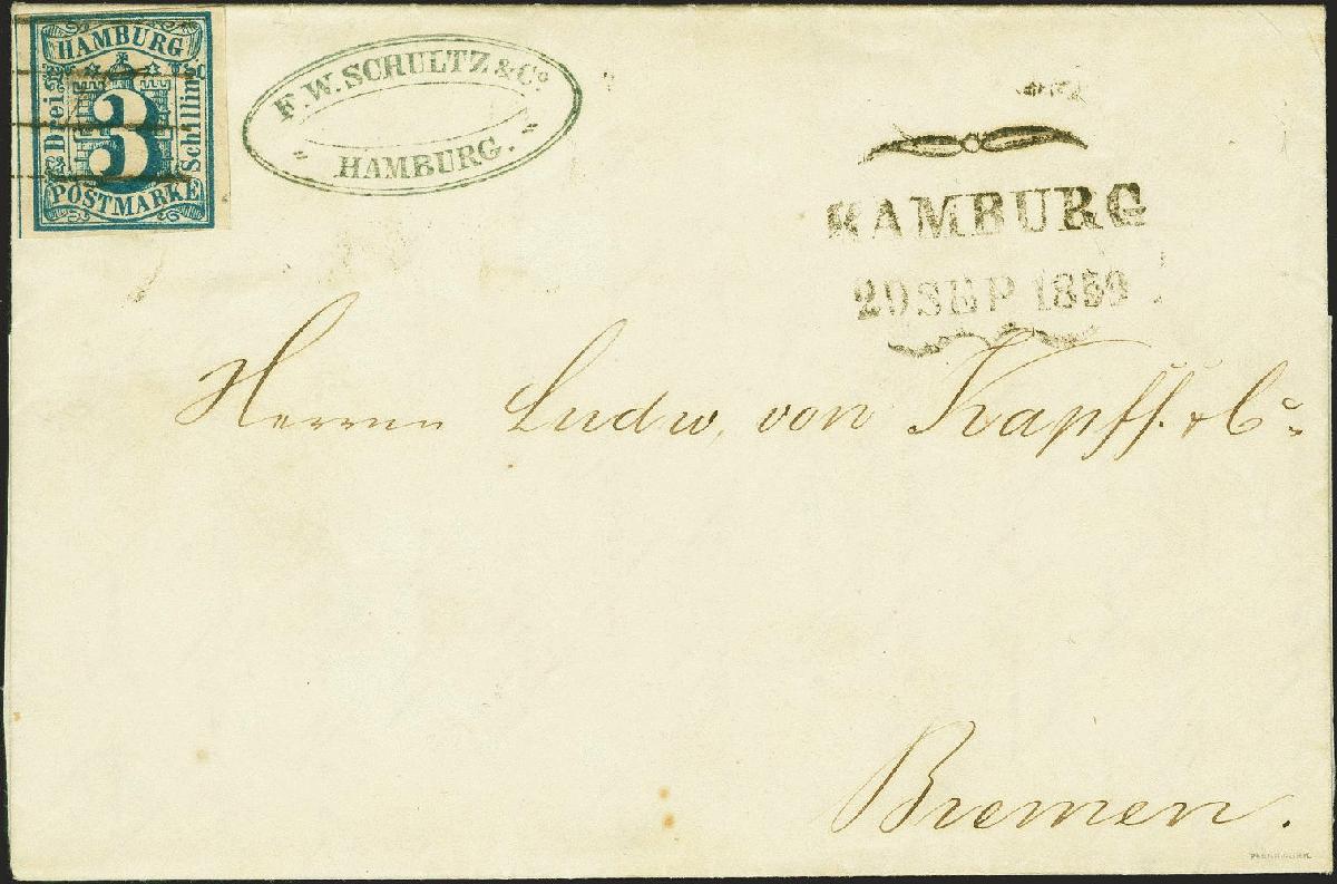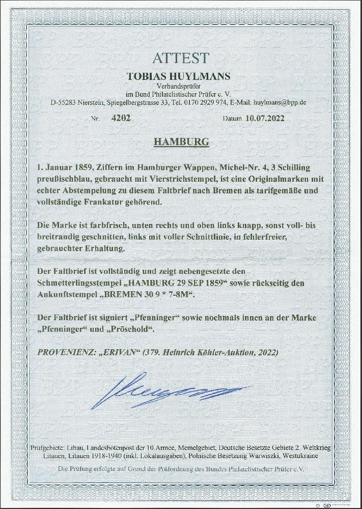 | Zusatzinformationen und Suchstichworte: | 379. Auktion Heinrich Köhler 19. - 24. September 2022 Los 81 3 Schilling preußischblau, voll- bis breitrandig und farbfrisch, mit sauber aufgesetztem Strichstempel und nebengesetztem Schmetterlingsstempel "HAMBURG 29 SEP 1859" auf komplettem Faltbrief nach Bremen mit Ankunftsstempel. Schöne und einwandfreie Erhaltung. Ein attraktiver Brief. Signiert Pfenninger und Pröschold , Fotoattest Huylmans BPP (2022) Ausruf 500,00 EUR Zuschlag 540,00 EUR (aus der Sammlung Erivan Haub) |