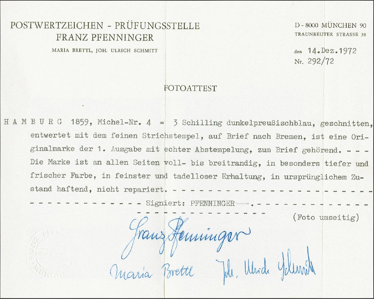 | Zusatzinformationen und Suchstichworte: | 379. Auktion Heinrich Köhler 19. - 24. September 2022 Los 81 3 Schilling preußischblau, voll- bis breitrandig und farbfrisch, mit sauber aufgesetztem Strichstempel und nebengesetztem Schmetterlingsstempel "HAMBURG 29 SEP 1859" auf komplettem Faltbrief nach Bremen mit Ankunftsstempel. Schöne und einwandfreie Erhaltung. Ein attraktiver Brief. Signiert Pfenninger und Pröschold , Fotoattest Huylmans BPP (2022) Ausruf 500,00 EUR Zuschlag 540,00 EUR (aus der Sammlung Erivan Haub) |