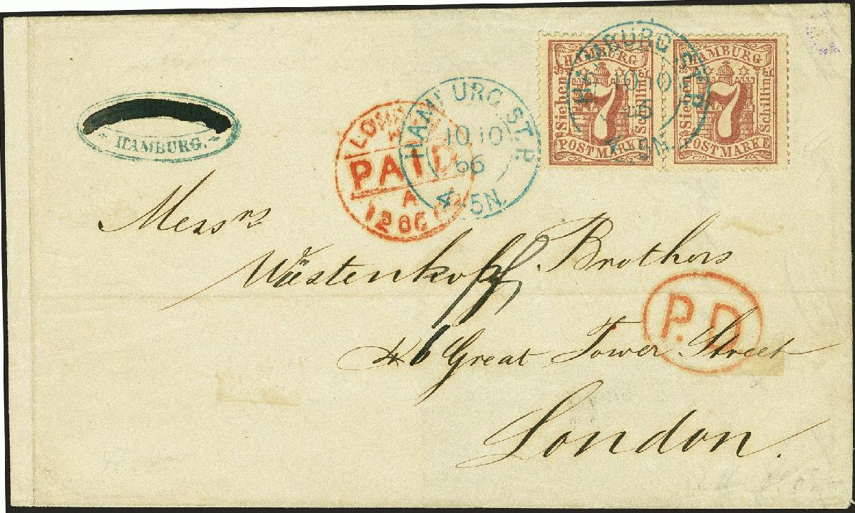 | Zusatzinformationen und Suchstichworte: | 379. Auktion Heinrich Köhler 19. - 24. September 2022 Los 84 7 Schilling bräunlichlila im waagerechten Paar, farbfrisch und gut gezähnt, mit sauber auf- und nebengesetztem blauen Doppelkreisstempel "HAMBURG ST. P. 10/10 66" auf Briefhülle der bekannten 'Wüstenkopf'-Korrespondenz nach London, Pracht. Fotoattest Huylmans BPP (2022) Ausruf 100,00 EUR Zuschlag 320,00 EUR (aus der Sammlung Erivan Haub) |