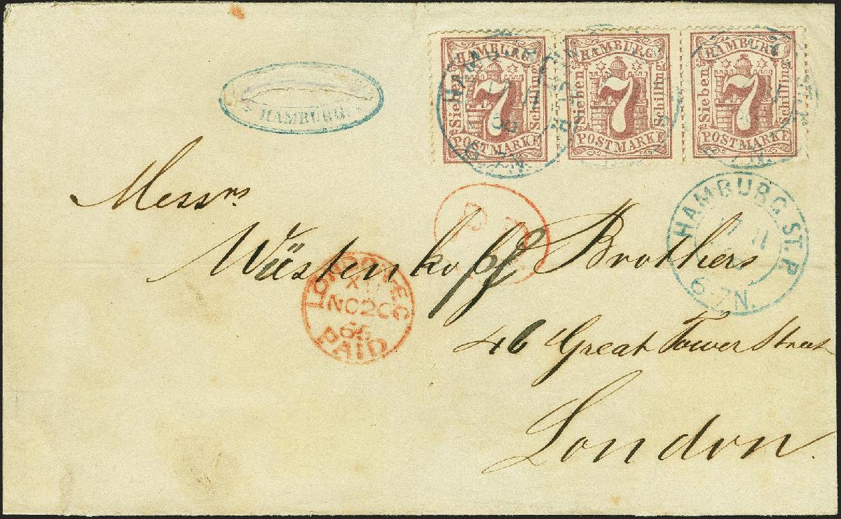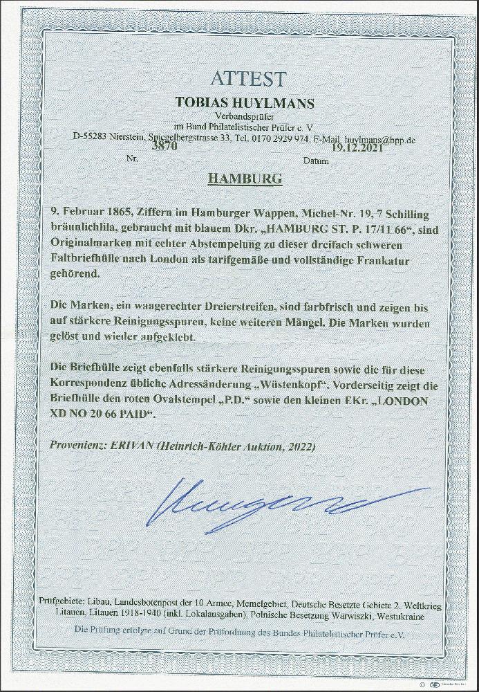 | Zusatzinformationen und Suchstichworte: | 379. Auktion Heinrich Köhler 19. - 24. September 2022 Los 85 7 Schilling bräunlichlila im waagerechten 3er-Streifen, farbfrisch und gut gezähnt, mit sauber auf- und nebengesetztem blauen Doppelkreisstempel "HAMBURG ST. P. 17/11 66" auf Briefhülle der bekannten 'Wüstenkopf'-Korrespondenz nach London. Bis auf Reinigungsspuren in einwandfreier Erhaltung. Fotoattest Huylmans BPP (2021) Ausruf 300,00 EUR Zuschlag 850,00 EUR (aus der Sammlung Erivan Haub) |