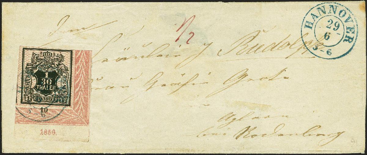 | Zusatzinformationen und Suchstichworte: | 379. Auktion Heinrich Köhler 19. - 24. September 2022 Los 100 1/30 Taler rosa genetzt, rechte untere Bogenecke, voll- bis breitrandig, rechts und unten mit vollen Bordürenrändern, unten mit Reihenzähler "10" und Jahreszahl "1856", mit sauber auf- und nebengesetztem Doppelkreisstempel "HANNOVER 29/6" auf kleiner Briefhülle nach Aglern bei Rodenberg mit rückseitigem Bahnpoststempel "BERLIN/MINDEN" und Ankunftsstempel. Bogenecken dieser Marke mit Jahreszahl sind große Seltenheiten, auf Brief haben wir kein weiteres Stück registriert. Signiert Rappaporte, Fotoatteste RPSL (1965) und Brettl/Schmidt (1982) Ausruf 5.000,00 EUR Zuschlag 19.000,00 EUR (aus der Sammlung Erivan Haub) |
