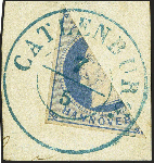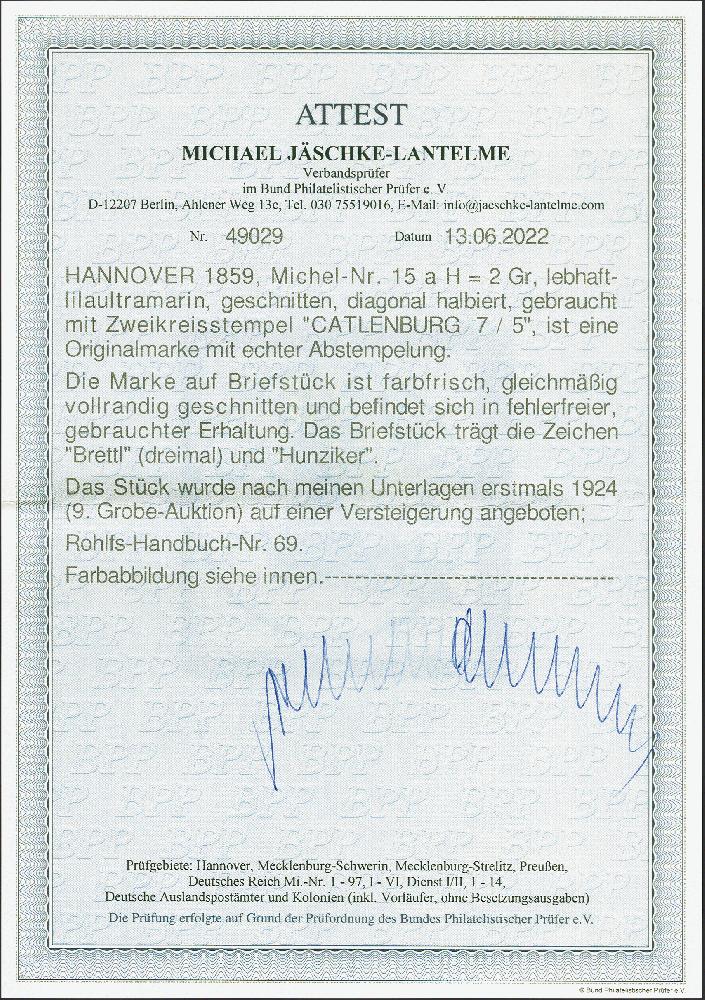 | Zusatzinformationen und Suchstichworte: | 379. Auktion Heinrich Köhler 19. - 24. September 2022 Los 105 1859, 2 Gr. ultramarin, diagonal halbiert, linke untere Hälfte, farbfrisch und gleichmäßig vollrandig geschnitten, mit zentrisch und klar aufgesetztem Doppelkreisstempel "CATLENBURG 7/5" auf Briefstück. Eine besonders attraktiver Halbierung dieser Marke in tadelloser Erhaltung. Signiert Brettl und Hunziker, Fotoattest Jäschke-Lantelme BPP (2022) Ausruf 1.000,00 EUR Zuschlag 2.700,00 EUR (aus der Sammlung Erivan Haub) |