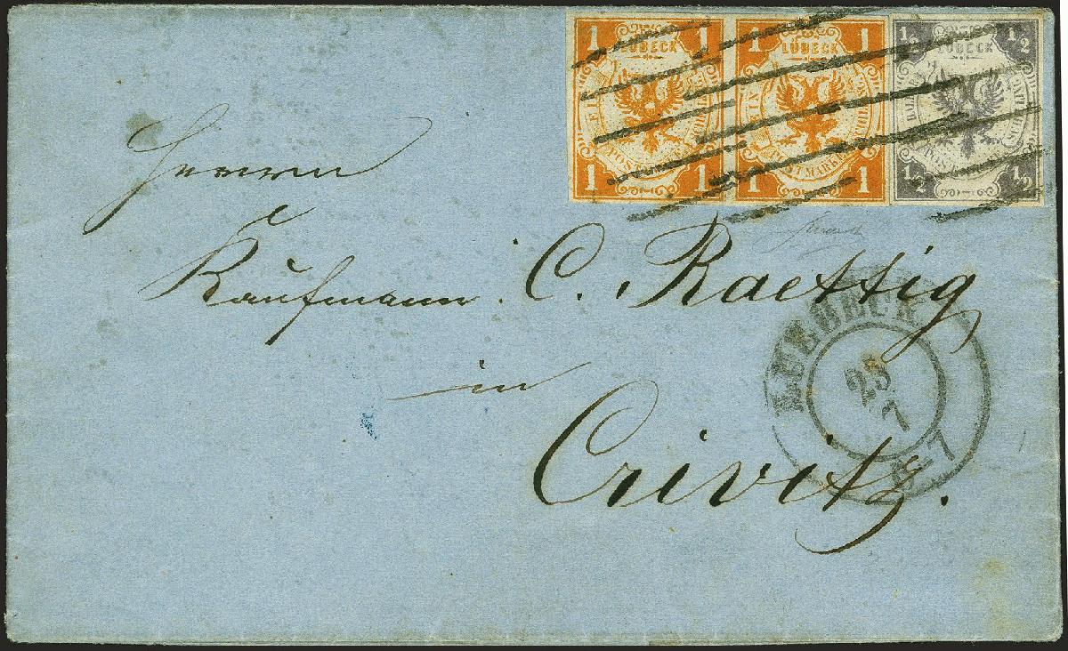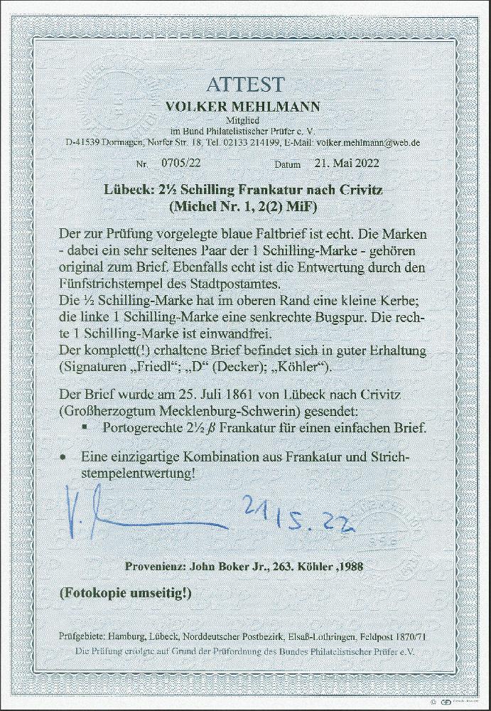 | Zusatzinformationen und Suchstichworte: | 379. Auktion Heinrich Köhler 19. - 24. September 2022 Los 111 1859, ½ Schilling dunkelviolettgrau und waagerechtes Paar 1 Schilling schwärzlichorange, alle in schöner tiefer und frischer Farbe und allseits breitrandig geschnitten, mit mehrfach sauber aufgesetztem Strichstempel auf komplettem Faltbrief mit nebengesetztem Doppelkreisstempel "LUEBECK 25/7" (1861) nach Crivitz in Mecklenburg. Die ½ Schilling kleiner Spalt oben bis in die Randlinie reichend, die linke 1 Schilling mit unauffälligem senkrechten Bug aufgeklebt, sonst einwandfreie frische und ursprüngliche Erhaltung. Dies ist mit Stempelentwertung sowohl die einzige derartige Frankaturkombination als auch das einzige Paar der Nummer 2 auf Brief, die wir registriert haben. Signiert Decker, Friedl und Köhler, Fotoattest Mehlmann BPP (2022) Ausruf 15.000,00 EUR Zuschlag 47.000,00 EUR (aus der Sammlung Erivan Haub) |