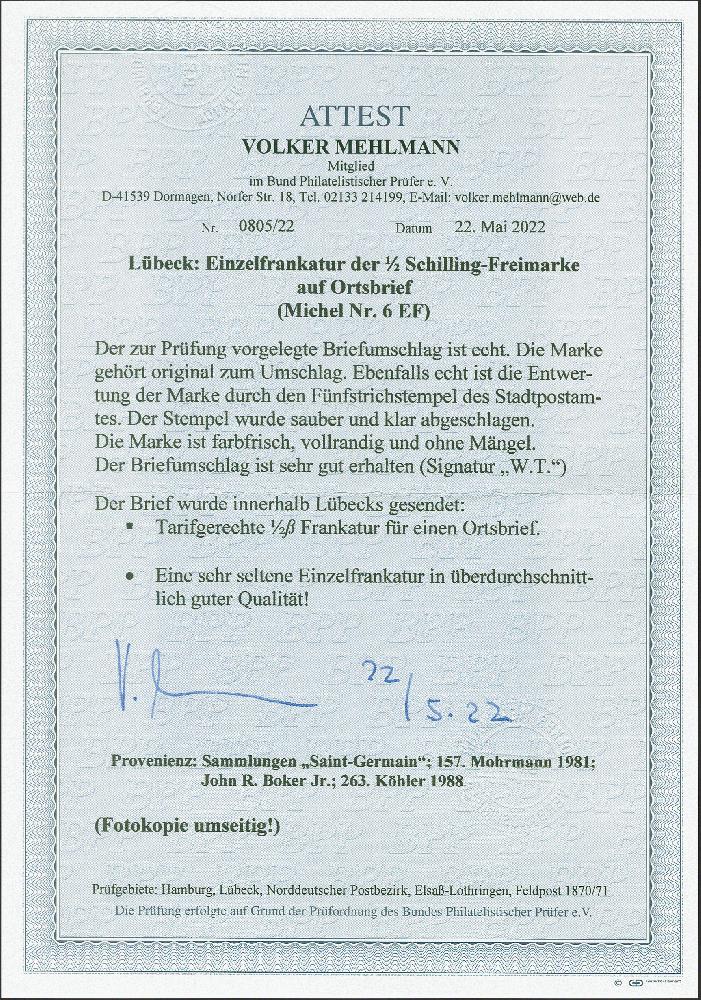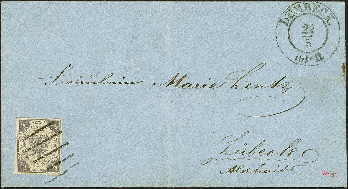 | Zusatzinformationen und Suchstichworte: | 379. Auktion Heinrich Köhler 19. - 24. September 2022 Los 114 1862, ½ Schilling, farbfrisch und allseits gut voll-bis sehr breitrandig, mit klar aufgesetztem Strichstempel und sehr schön abgeschlagenem Doppelkreisstempel "LUEBECK 22/5" auf blauem Briefkuvert als Ortsbrief gelaufen. Sehr schöne frische und tadellose Erhaltung. Es sind nur rund ein Dutzend Einzelfrankaturen dieser Marke registriert; die hier angebotene ist unseres Erachtens die schönste bekannte. Fotoattest Mehlmann BPP (2022) Ausruf 4.000,00 EUR Zuschlag 16.000,00 EUR (aus der Sammlung Erivan Haub) |
