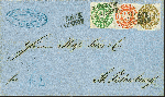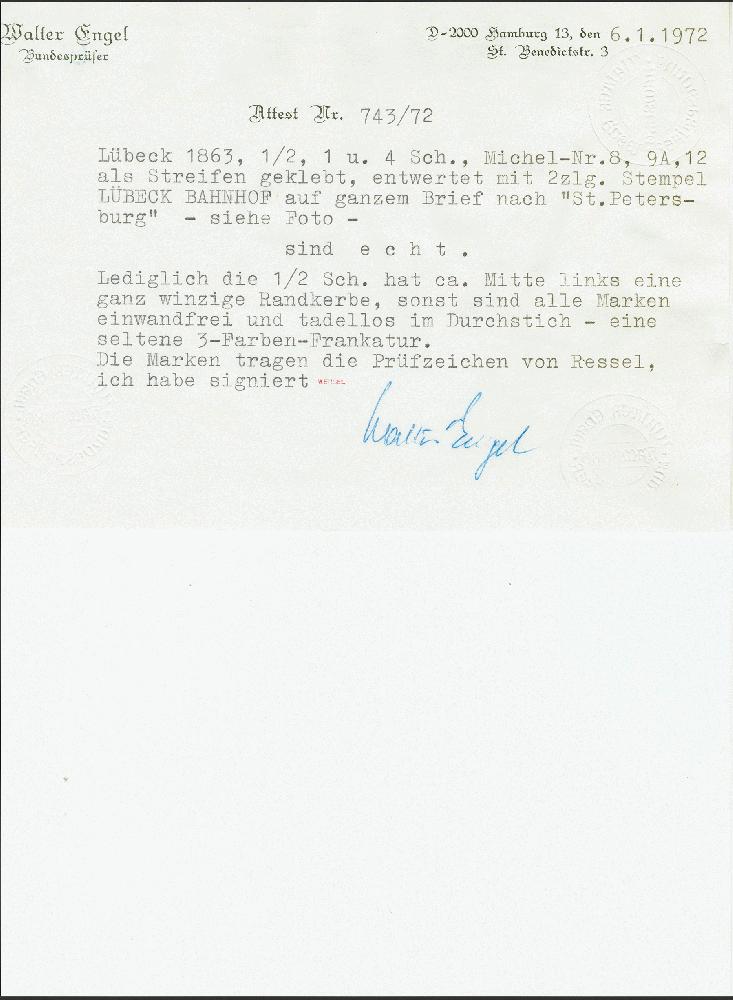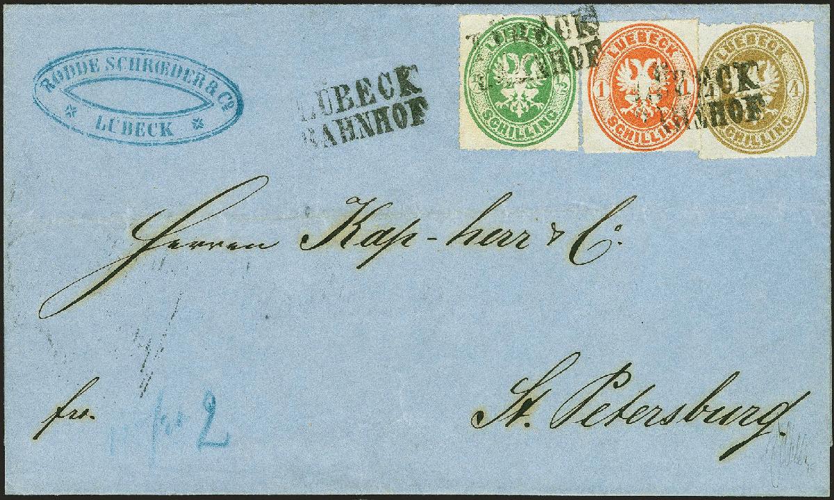 | Zusatzinformationen und Suchstichworte: | 379. Auktion Heinrich Köhler 19. - 24. September 2022 Los 117 1863, 4 Schilling ockerbraun, ½ Schilling grün und 1 Schilling rötlichorange, alle farbfrisch und bis auf kleine Durchstichkerbe bei der ½ Schilling einwandfrei durchstochen, mit sauber auf- und nebengesetztem Langstempel "LÜBECK BAHNHOF" auf Briefhülle nach Sankt Petersburg mit rückseitigen Bahnpoststempeln "LÜBECK-HAMBURG" und "HAMBURG-BERLIN". Sehr schöne und besonders frische, tadellose Erhaltung. 3 Farben-Frankaturen der Prägedruckausgabe sind außerordentlich selten, in dieser Kombination haben wir nur eine weitere registriert. Signiert Ressel, Kruschel, Jakubek und W. Engel, Fotoattest Mehlmann BPP (2022) Ausruf 2.000,00 EUR Zuschlag 9.000,00 EUR (aus der Sammlung Erivan Haub) |