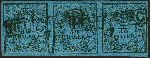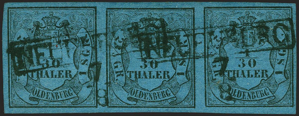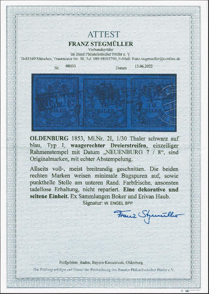 | Zusatzinformationen und Suchstichworte: | 379. Auktion Heinrich Köhler 19. - 24. September 2022 Los 122 1/30 Thaler auf blau, Type I, waagerechter 3er-Streifen, farbfrisch und voll- bis breitrandig, sauber entwertet mit vorphilatelistischem Rahmenstempel "NEUENBURG 7/8". Die beiden rechten Marken minimale Bugspuren und winzige punkthelle Stelle am Unterrand, sonst tadellose und frische Erhaltung. Fotoattest Stegmüller BPP (2022) Ausruf 200,00 EUR Zuschlag 320,00 EUR (aus der Sammlung Erivan Haub) |
