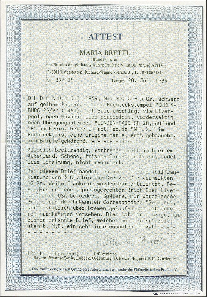 | Zusatzinformationen und Suchstichworte: | 379. Auktion Heinrich Köhler 19. - 24. September 2022 Los 132 3 Groschen auf gelb, farbfrisch und voll- bis meist breitrandig, mit blauem Rahmenstempel "OLDENBURG 25/9"(1860) auf Briefkuvert über Aachen und London nach Havanna, Kuba mit rückseitigem Ankunftsstempel vom 24. Oktober. Der Brief war mit 22 Groschen voll bezahlt, jedoch nur das Vereinsporto mit Marke verklebt, das Weiterfranko in bar verrechnet und vorder- und rückseitig notiert. Das Kuvert wurde gereinigt, die Marke zu diesem Zweck gelöst, sonst einwandfreie und schöne Erhaltung. Einer der seltensten Auslandsbriefe Oldenburgs. Signiert Friedl, Wien und Fotoattest Brettl BPP (1989) Ausruf 5.000,00 EUR Zuschlag 24.000,00 EUR (aus der Sammlung Erivan Haub) |