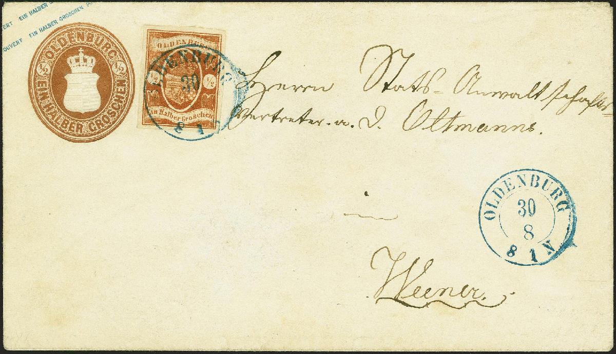 | Zusatzinformationen und Suchstichworte: | 379. Auktion Heinrich Köhler 19. - 24. September 2022 Los 136 1861, ½ Groschen orangebraun, farbfrisch und voll-bis meist breitrandig, mit sauber auf- und nebengesetztem blauen Doppelkreisstempel "OLDENBURG 30 8" als Zufrankatur auf Ganzsachenumschlag 1861, ½ Groschen dunkelbraun im Kleinformat nach Weener. Das Kuvert rückseitig übliche leichte Öffnungsspuren, sonst tadellose und frische Erhaltung. Eine außerordentlich seltene und attraktive Kombination. Fotoattest Stegmüller BPP (2022) Ausruf 7.000,00 EUR Zuschlag 17.000,00 EUR (aus der Sammlung Erivan Haub) |