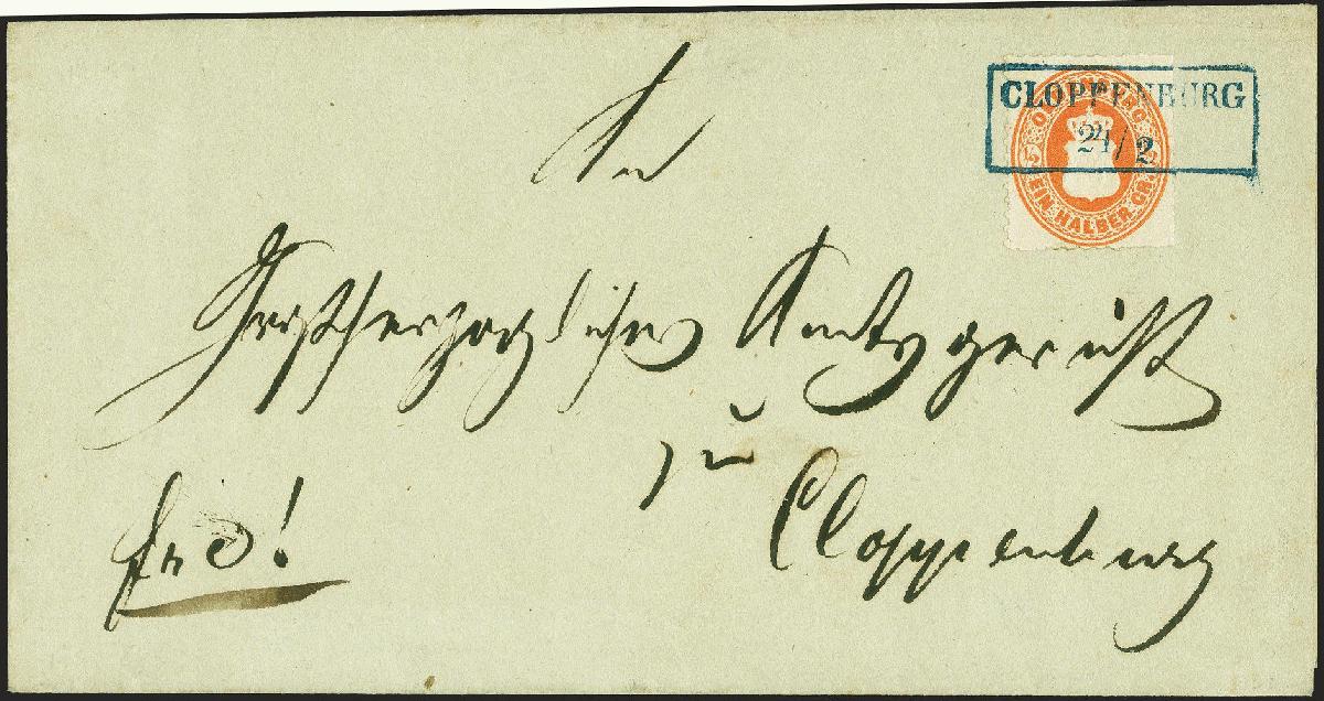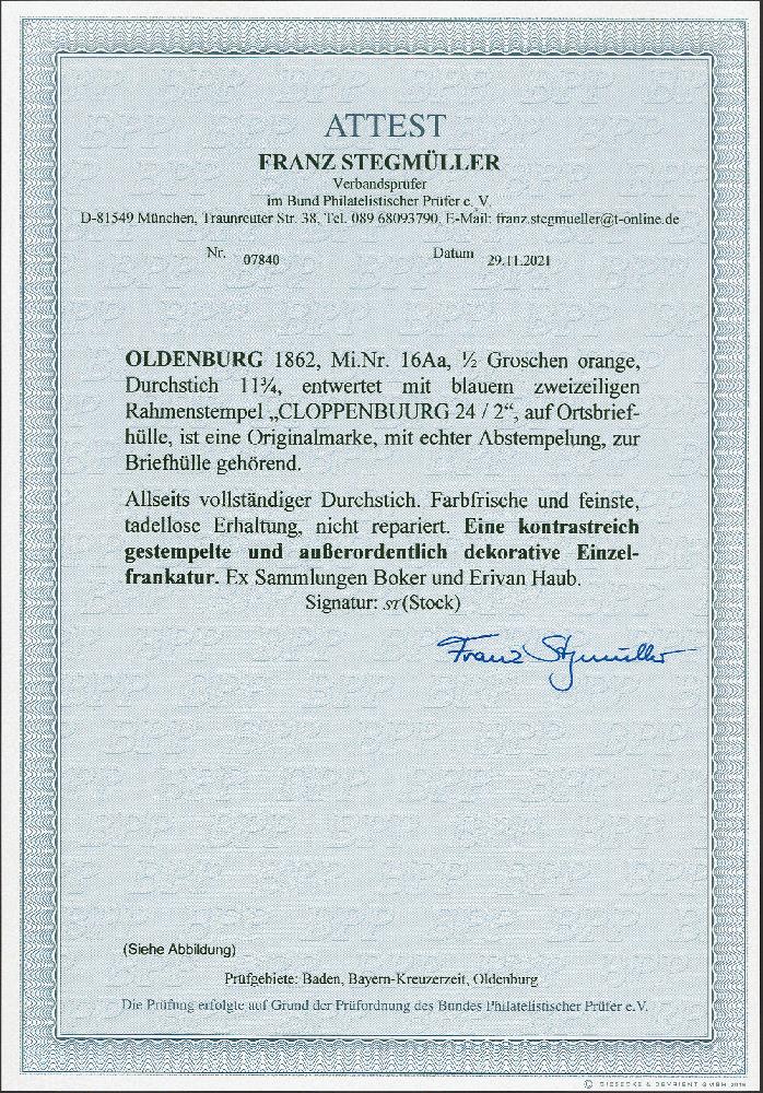 | Zusatzinformationen und Suchstichworte: | 379. Auktion Heinrich Köhler 19. - 24. September 2022 Los 137 ½ Groschen orange, sehr schön farbfrisch und einwandfrei durchstochen, mit klar aufgesetztem blauem Rahmenstempel "CLOPPENBURG 24/2" auf Ortsbriefhülle. Besonders schöne und frische, tadellose Erhaltung. Ausruf 200,00 EUR Zuschlag 1.400,00 EUR (aus der Sammlung Erivan Haub) |