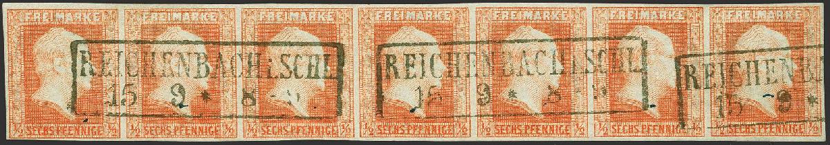 | Zusatzinformationen und Suchstichworte: | 379. Auktion Heinrich Köhler 19. - 24. September 2022 Los 149 ½ Silbergroschen rotorange im waagerechten 7er-Streifen, meist sehr schön farbfrisch und voll- bis breitrandig, mit sauber aufgesetztem Rahmenstempel "REICHENBACH i. SCHL. 15 9", leicht gereinigt, sonst tadellos. Ein seltener und sehr attraktiver Streifen. Signiert Drahn, Grobe und Kruschel, Fotoattest Jäschke-L. BPP (2022) Ausruf 1.500,00 EUR Zuschlag 1.500,00 EUR (aus der Sammlung Erivan Haub) |
