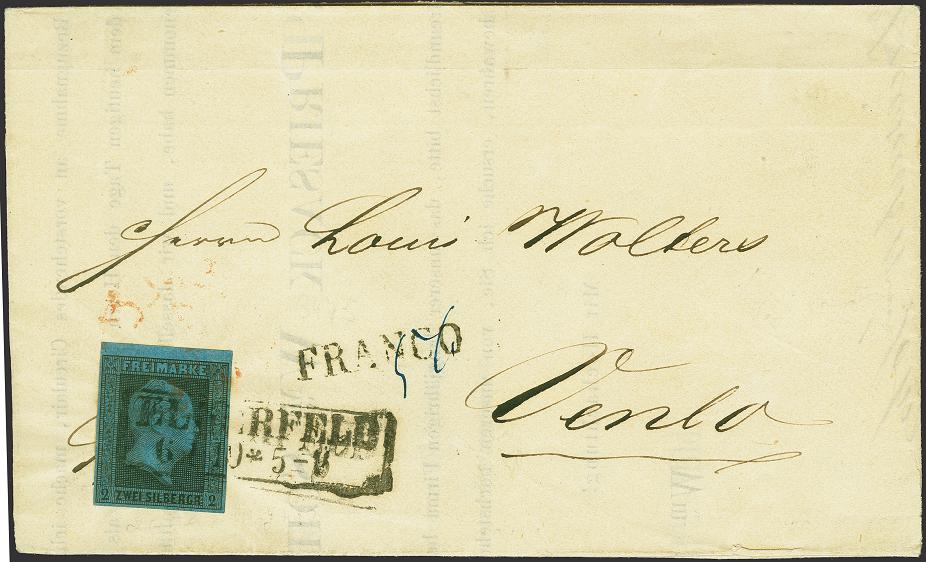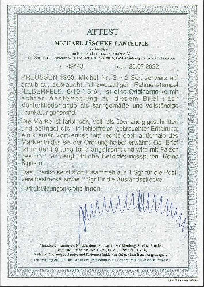 | Zusatzinformationen und Suchstichworte: | 379. Auktion Heinrich Köhler 19. - 24. September 2022 Los 163 2 Silbergroschen schwarz auf graublau, farbfrisch und voll- bis breitrandig, mit sauber aufgesetztem Rahmenstempel "ELBERFELD 6/10 auf Faltbrief mit gedrucktem Text nach Venlo in den Niederlanden mit Ankunftsstempel. Die Frankatur ist einwandfrei, der Brief in den Faltungen teils an getrennt bzw. mit Falzen gestützt. Fotoattest Jäschke-L. Ausruf 200,00 EUR Zuschlag 540,00 EUR (aus der Sammlung Erivan Haub) |