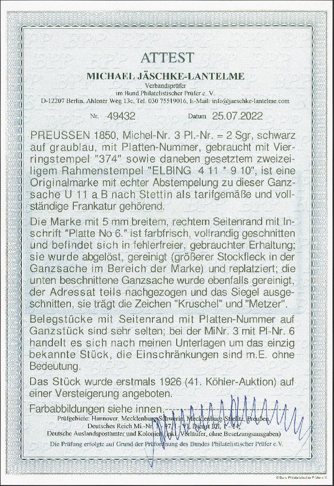 | Zusatzinformationen und Suchstichworte: | 379. Auktion Heinrich Köhler 19. - 24. September 2022 Los 165 2 Silbergroschen schwarz auf graublau, farbfrisch und voll- bis breitrandig, rechts mit ca. 5 mm Bogenrand, mit großem Teil der Inschrift "Platte No. 6" als Zufrankatur auf Ganzsachenumschlag 1855, 1 Silbergroschen rosa im Großformat (unten beschnitten und eine Verschlussklappe fehlend), mit sauber nebengesetztem Rahmenstempel "ELBING 4 11" nach Stettin. Die Marke wurde gelöst und wie die Ganzsache gereinigt, der Name in der Adresse teils nachgezogen, sonst einwandfrei. Marken mit Plattenummern sind auf Brief außerordentlich selten. Dies ist das einzig registrierte Exemplar einer 2 Silbergroschen-Marke mit der Platten-Nr. 6. Signiert Metzer und Kruschel, Fotoattest Jäschke-L. BPP (2022) Ausruf 5.000,00 EUR Zuschlag 13.000,0 EUR (aus der Sammlung Erivan Haub) |