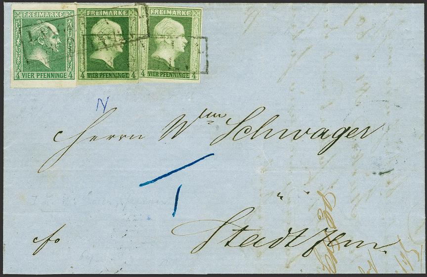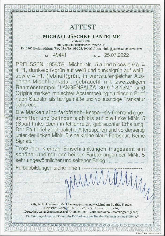 | Zusatzinformationen und Suchstichworte: | 379. Auktion Heinrich Köhler 19. - 24. September 2022 Los 169 1856, 4 Pfennige grün und 4 Pfennige dunkelgrün, in Mischfrankatur mit Gittergrund 4 Pfennige grün, alle farbfrisch und voll- bis breitrandig, als Streifen geklebt, mit Rahmenstempel "LANGENSALZA 30 9" auf komplettem Faltbrief nach Stadtilm die dunkelgrüne oben links minimaler Randspalt und auf dem Briefpapier kleine Fremdbeschriftung, sonst einwandfreie Erhaltung. Eine außerordentlich seltene Mischfrankatur, wir haben keine weitere in dieser Kombination registriert. Fotoattest Jäschke-L. BPP (2022) Ausruf 2.000,00 EUR Zuschlag 9.000,00 EUR (aus der Sammlung Erivan Haub) |