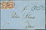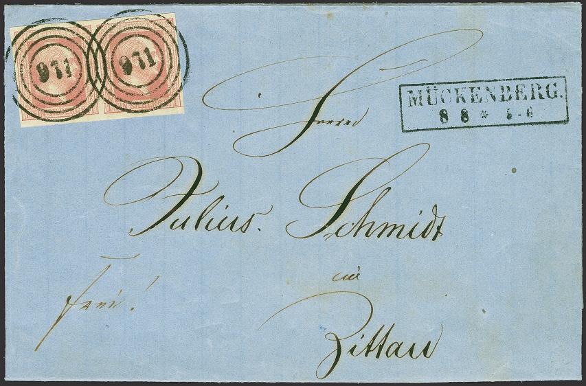 | Zusatzinformationen und Suchstichworte: | 379. Auktion Heinrich Köhler 19. - 24. September 2022 Los 174 1 Silbergroschen rosa im waagerechten Paar, farbfrisch und voll- bis breitrandig, mit sauber aufgesetzter Nr. "971"und nebengesetztem Rahmenstempel "MÜCKENBERG 8/8" auf Briefhülle nach Zittau. Ein attraktiver Brief in gute Erhaltung. Fotoattest Jäschke-L. BPP (2022) Ausruf 200,00 EUR Zuschlag 380,00 EUR (aus der Sammlung Erivan Haub) |