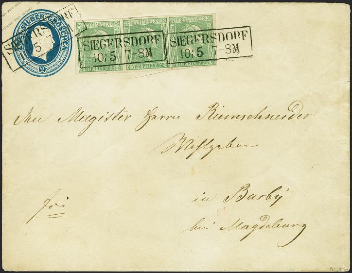 | Zusatzinformationen und Suchstichworte: | 379. Auktion Heinrich Köhler 19. - 24. September 2022 Los 183 Umschlag 2 Silbergroschen ultramarin im Großformat mit Zufrankatur Gittergrund 4 Pfennige grün, drei Einzelwerte, der rechts klebende links leicht berührt und kleine Stelle lupenrandig, sonst alle voll-bis breitrandig und farbfrisch, mit dreimal sauber aufgesetztem Rahmenstempel "SIEGERSDORF 10/5" nach Barby bei Magdeburg. Die Verschlussklappe oben rechts etwas an getrennt, sonst einwandfrei. Eine ungewöhnliche und attraktive Kombination. Fotoattest Jäschke-Lantelme BPP (2022) Ausruf 300,00 EUR Zuschlag 750,00 EUR (aus der Sammlung Erivan Haub) |